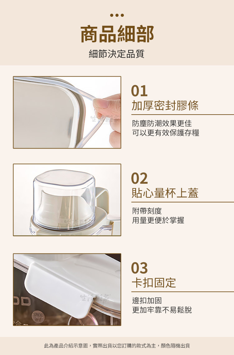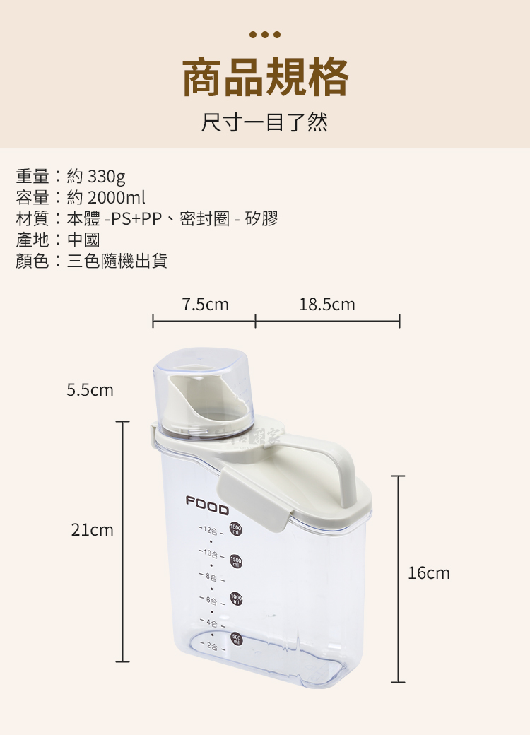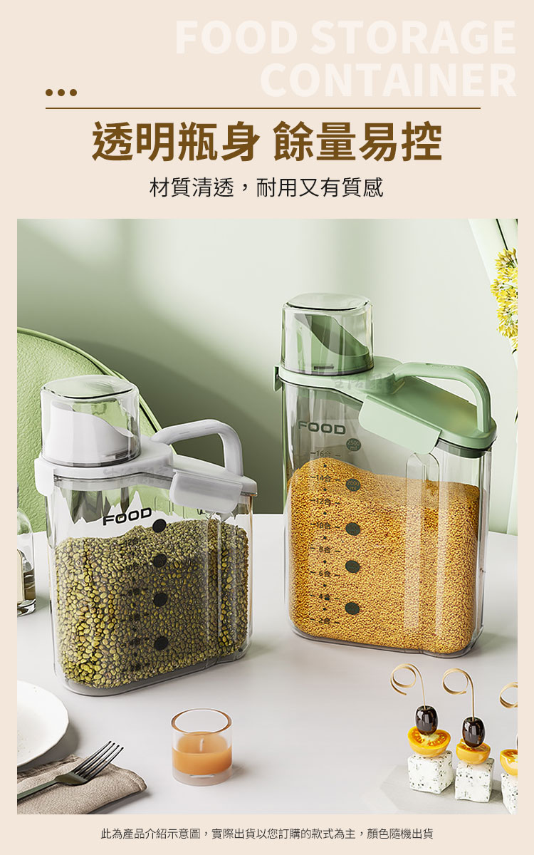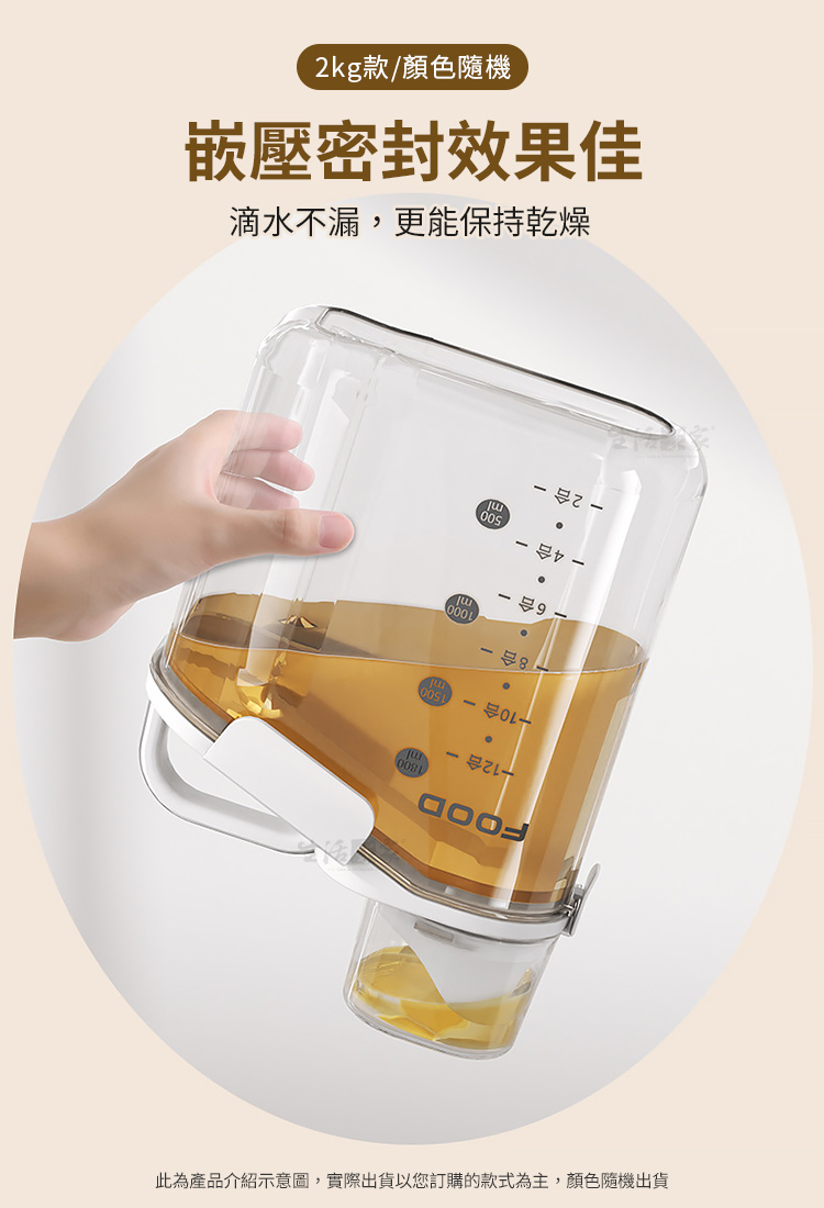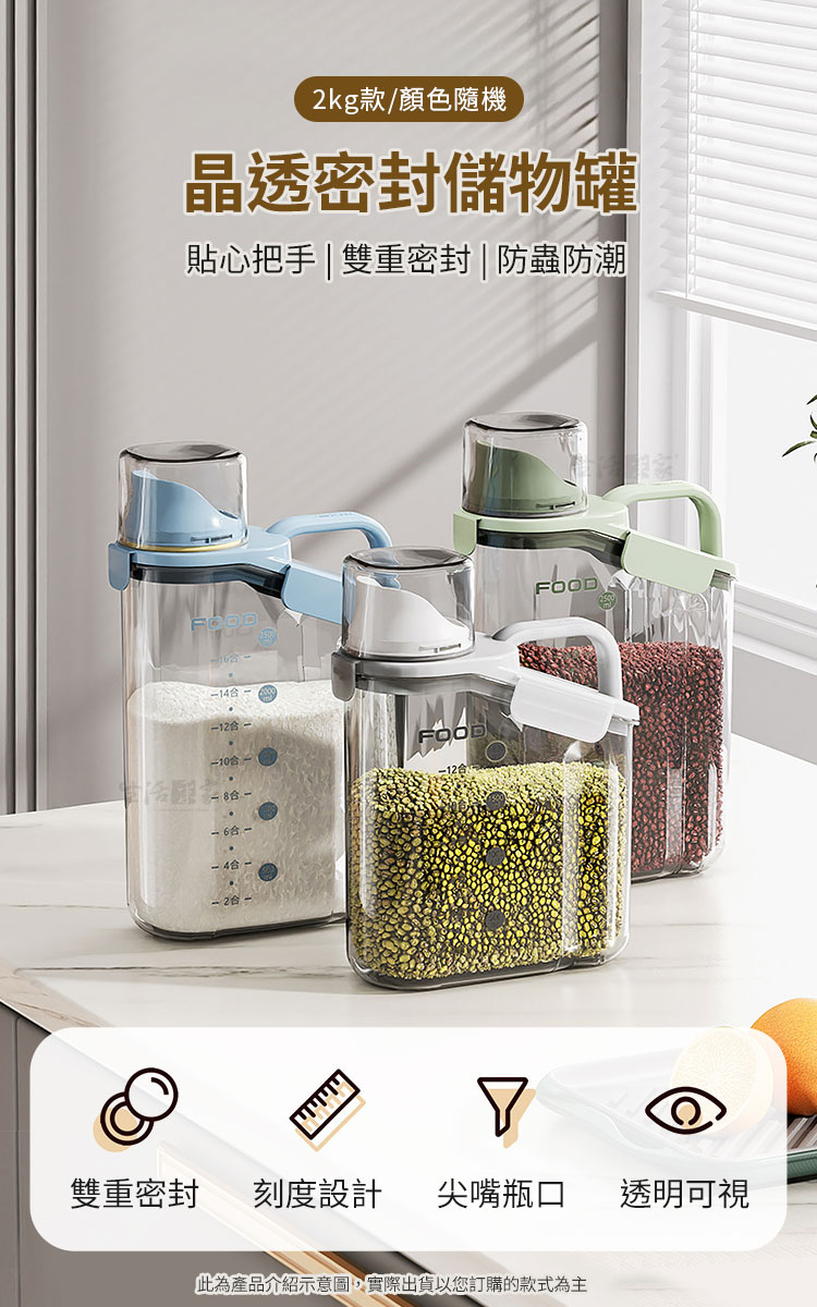 1.尺寸:約W26.5*L4*H26cm 2.材質:PS、PP塑料、矽膠條 3.容量:約2000ml 4.重量:約330g 5.產地:中國 6.顏色:白、綠、藍(隨機出貨) 7.商品:透明手提密封儲物罐2kg*2