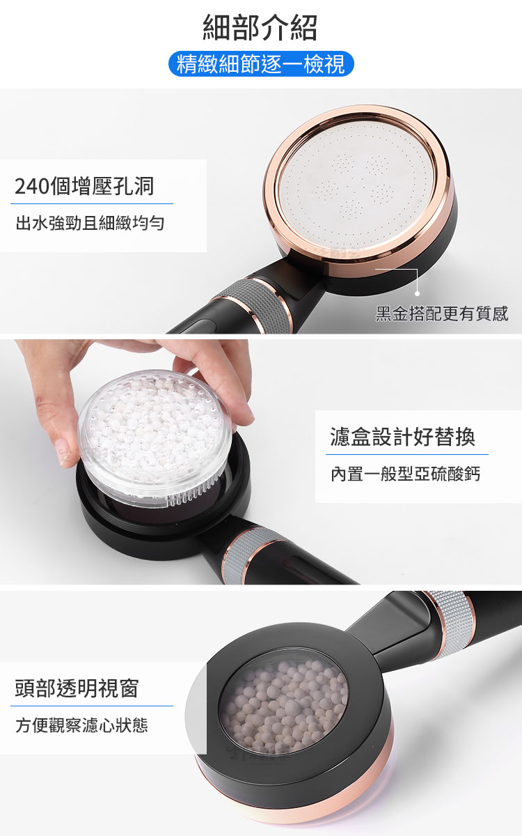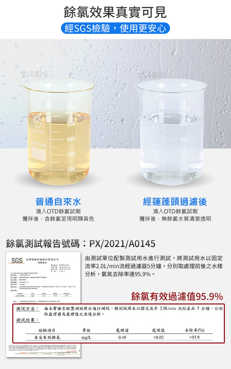 ◆貼心調節環,轉動可調整水流強弱,大人小孩都能洗個舒服的澡。 ◆出水採用304不鏽鋼增壓板,低水壓水流能獲得一定程度的增壓效果,讓水流變強。 ◆增壓板密佈240個細孔,讓出水細緻均勻,更能節省水量的使用,達到省水效果。 ◆集中式水流設計,強制讓水經過每一個角落、濾材有效過濾,增加用水的乾淨度!! ◆高精度PP棉濾心,精度5~10微米,能有效過濾泥沙雜物、鐵鏽、毛屑、懸浮物等! ◆亞硫酸鈣濾心,餘氯吸附量比活性碳多200倍以上,能有效降低水中餘氯。 ◆本體採用黑色外殼,搭配透明視窗,使用時髒污程度看得見,隨時掌握濾心的使用程度!! ◆安裝在淋浴間,減少水中的"氯,才不會在您洗頭髮、沐浴或幫小寶寶洗澡時被人體吸收。 ◆餘氯容易與水中的有機物質混合產生三滷甲烷,可能危害人體肌膚,千萬要注意。 ◆不同地區水質髒污程度不同,建議當PP棉變成深色或水流變小時即可更換濾芯。 ◆SGS檢測餘氯有效過濾值可達95.9%(報告號碼-PX/2021/A0145),真的能有效降低水中餘氯。 ◆SGS檢測重金屬均為未檢出(報告號碼-ABA21B00360),能有效過水中重金屬、雜質等。 ◆經工研院省測試合格(報告號碼-11055C01890-1-1-01),省水標章許可證號:211103921001。