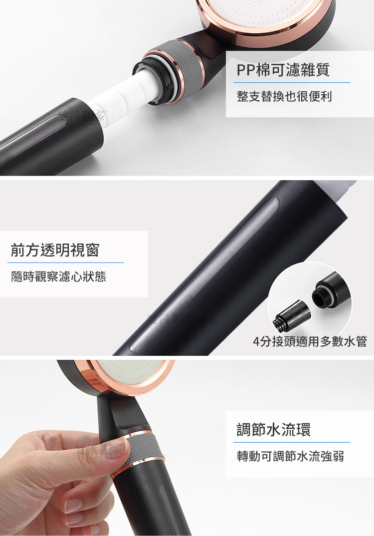 挑選一支好用的蓮蓬頭很重要~保養品拼命擦,但盥洗的水卻不講究! 沒錯,平日裡保養品一直擦不如先用乾淨的水來洗淨吧,這樣你的肌膚會很高興哦! 【生活采家淨水過濾器系列】調節水流增壓過濾花灑蓮蓬頭~轉動調節環能調整水流強弱,大人喜歡的水流強度,兒童不一定喜歡,甚至有時會感到刺痛,轉一轉調整水流強弱,小朋友們就能洗個舒服的澡了;內置PP棉及亞硫酸鈣濾心能迅速有效降低水中的餘氯、過濾 懸浮物、泥沙、鐵屑、昆蟲等雜質,讓您家中的自來水變成更舒淨的水質,絕對是一支好用的蓮蓬頭!