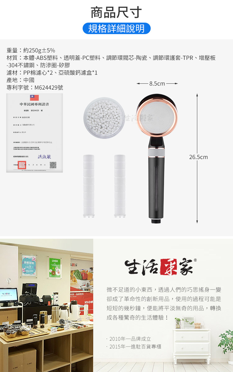 1.尺寸:長26.5*寬8.5cm 2.材質:本體-ABS塑料、透明蓋-PC塑料、調節環閥芯-陶瓷、調節環護套-TPR、增壓板-304不鏽鋼、防滲圈-矽膠、濾心-PP棉、亞硫酸鈣 3.重量:約260g/組±2% 4.安裝:適用4分(1/2'或20mm)內牙水管 5.使用水溫:50℃以下 6.工作水壓:0.1MPa~0.4MPa 7.過濾精度:5~10微米 8.商品:調節增壓過濾蓮蓬頭*1、PP濾心*2、亞硫酸鈣盒*1 9.濾心時效:PP棉1~2個月、亞硫酸鈣2~4個月(當PP棉明顯變深或水流變小時即可更換濾心) 10.檢測:工研院省水(報告號碼-11055C01890-1-1-01)、省水標章(許可證號:211103921001)、SGS檢測重金屬合格(報告號碼-ABA21B00360)、SGS檢測餘氯去除率達95.9%(報告號碼-PX/2021/A0145) 11.專利字號:新型第M624429號 12.適用水源:家用自來水 13.產地:中國