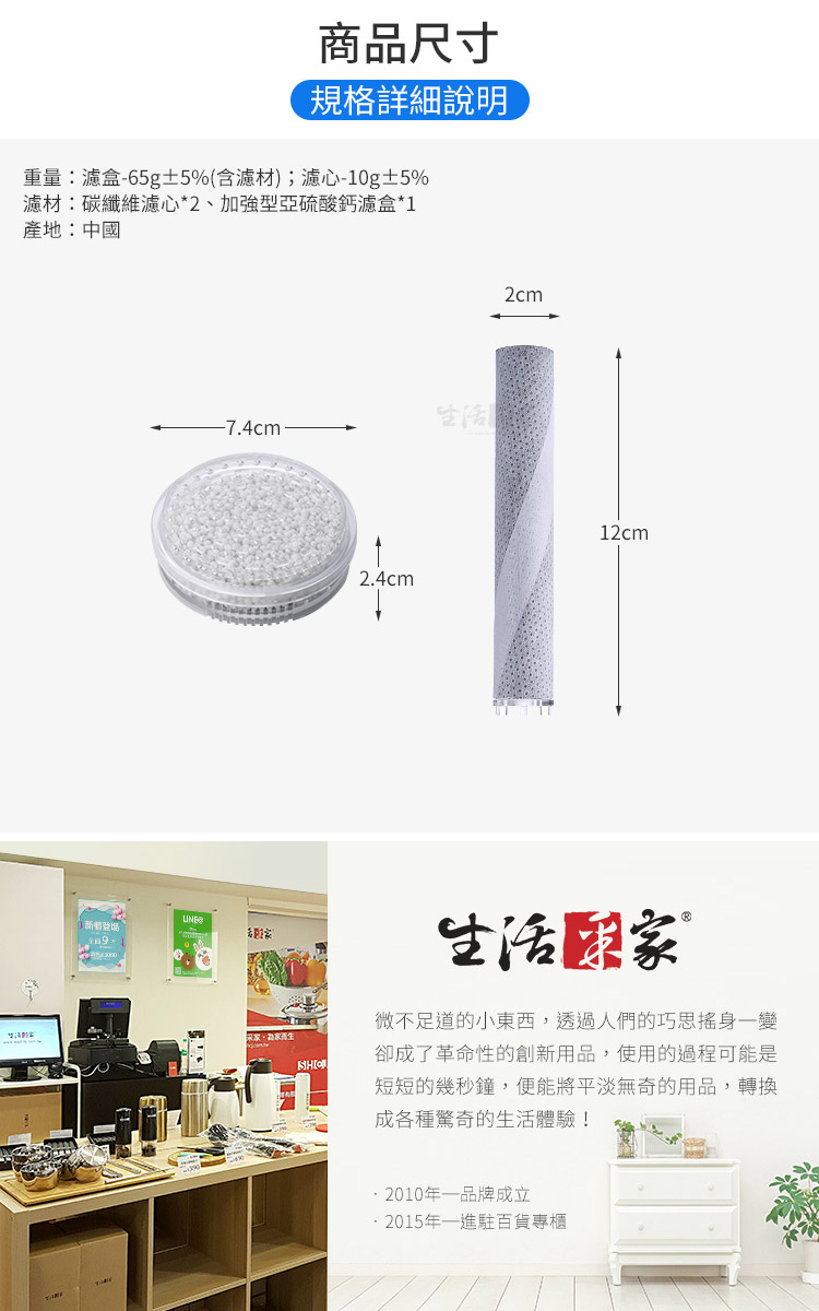 1.尺寸:濾心-約直徑2*長12cm;濾盒-直徑7.4*高2.4cm 2.濾材:濾心-碳纖維棉、濾盒-加強型亞硫酸鈣 3.重量:約85g/組±5% 4.適用:調節增壓過濾蓮蓬頭#99497、#99498 5.使用水溫:50℃以下 6.工作水壓:0.1MPa~0.4MPa 7.過濾精度:5~10微米 8.商品:碳纖維棉濾心*2、加強型亞硫酸鈣盒*1 9.濾心時效:碳纖維棉1~2個月、加強型亞硫酸鈣2~4個月(當碳纖維棉明顯變深或水流變小時即可更換濾心) 10.檢測:SGS檢測重金屬合格(報告號碼-ABA21B00360)、SGS檢測餘氯去除率達95.9%(報告號碼-PX/2021/A0146) 11.適用水源:家用自來水 12.產地:中國