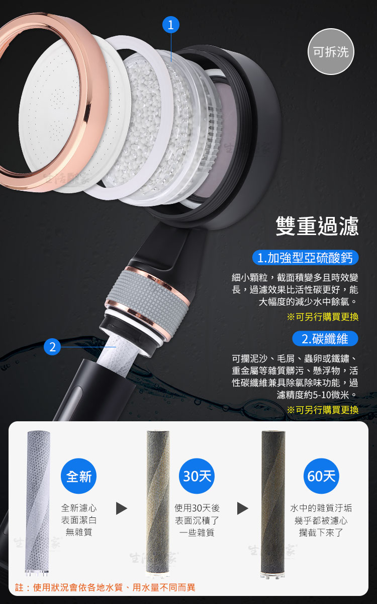 適用機種-調節增壓過濾蓮蓬頭#99497、#99498、#60004 ◆集中式水流設計,強制讓水經過每一個角落、濾材有效過濾,增加用水的乾淨度。 ◆高精度碳纖維棉濾心,精度5~10微米,能有效除臭、過濾泥沙雜物、鐵鏽、毛屑、懸浮物等。 ◆碳纖維棉比PP棉在過濾餘氯效果上多1倍以上,能更加有效的加強餘氯過濾效果。 ◆加強型亞硫酸鈣濾心,餘氯吸附量比活性碳多200倍以上,能有效降低水中餘氯。 ◆加強型亞硫酸鈣濾心顆粒較一般亞硫酸鈣小顆,能大幅度增加過濾面積,更有效去除餘氯。 ◆安裝在花灑裡,減少水中的"氯,才不會在您洗頭髮、沐浴或幫小寶寶洗澡時被人體吸收。 ◆餘氯容易與水中的有機物質混合產生三滷甲烷,可能危害人體肌膚,千萬要注意。 ◆不同地區水質髒污程度不同,建議當碳纖維棉變成深色或水流變小時即可更換濾芯。 ◆SGS檢測餘氯有效過濾值可達95.9%(報告號碼-PX/2021/A0146),真的能有效降低水中餘氯。 ◆SGS檢測重金屬均為未檢出(報告號碼-ABA21B00360),能有效過水中重金屬、雜質等。