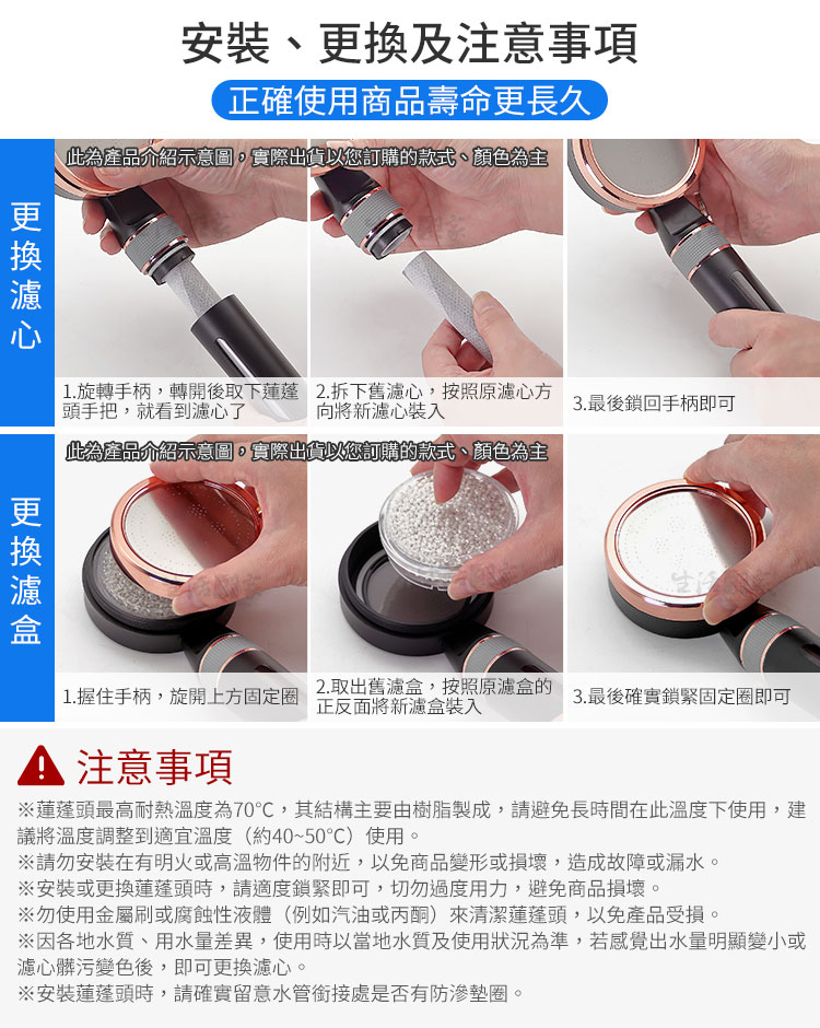 注意事項: 1.請勿重摔或高處掉落,以免商品受損。 2.商品情境圖片僅供參考,實際出貨不含週邊道具及配件。 3.此為補充濾心組,出貨時不含花灑、黑色掛架及花灑管,訂購前請留意。 4.本品為拋棄式濾心,使用壽命依各地水質狀況而異,替換時間約為1~2個月。 5.購買前請先確認適用機種,確定無誤後再購買以免尺寸不合,敬請謹慎選購。 6.不同地區因水質軟硬度、餘氯濃度或懸淨物含量及日常用水量不同,除氯效果及使用時間會有差異。 7.本品為消耗性商品,除本身瑕疵或不良外,一經拆封或安裝、使用,不得要求退換貨,敬請謹慎選購。 8.本品僅能基本餘氯95.9%及過濾雜質,如有高度過濾需求或高度水質要求者,請另購專業型機種。