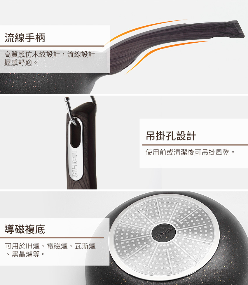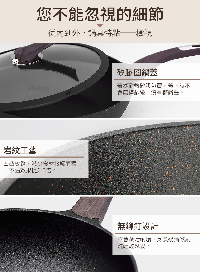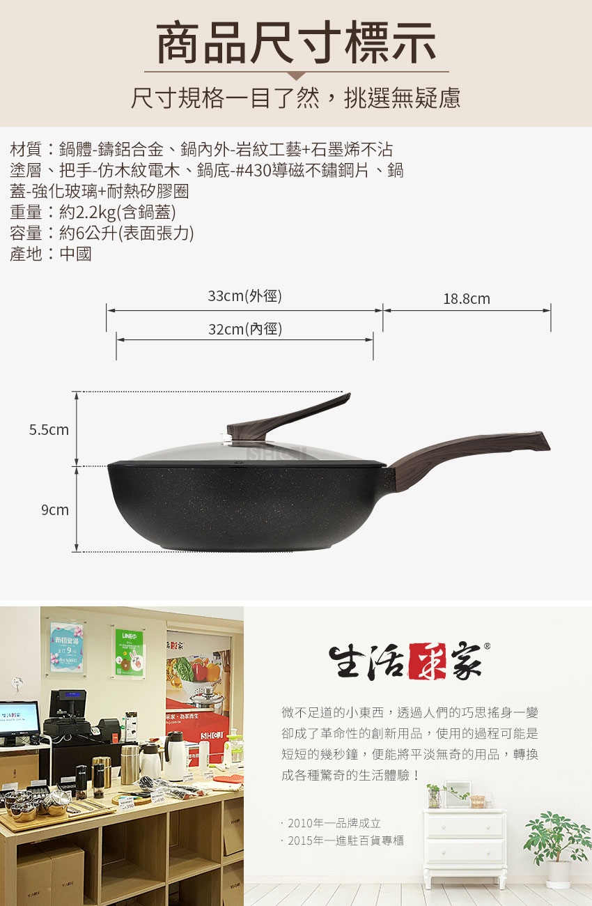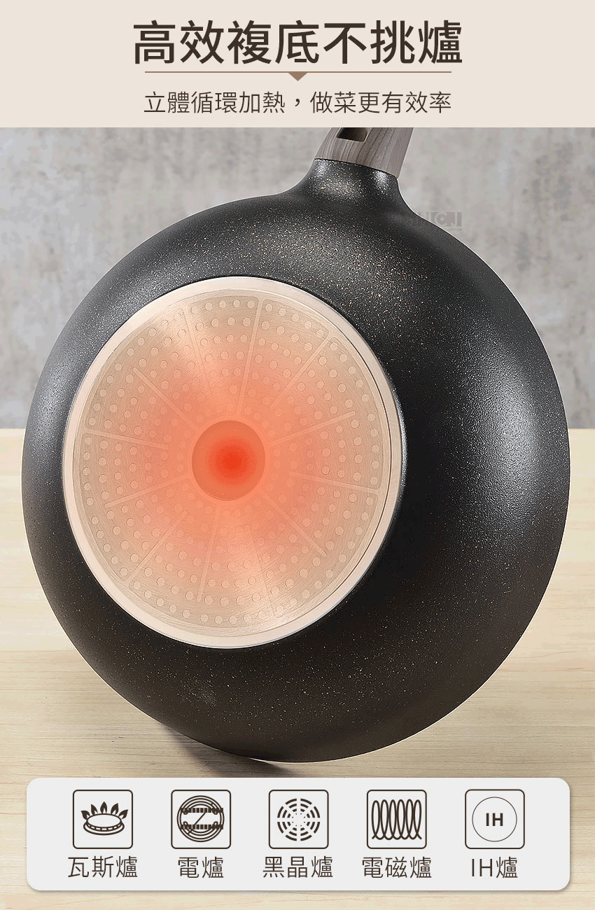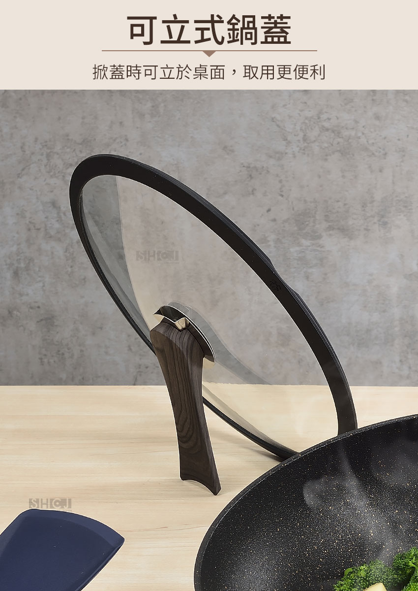 ◆鍋徑32cm、鍋深9cm,煎、炒、煮等完全沒問題。 ◆不鏽鋼飾片,讓鍋具整體更添質感,廚房也是您的時尚舞台。 ◆添加石墨烯塗層,導熱效能提升50%,熱鍋更快、更均勻。 ◆鍋內外均採用特殊岩紋凹凸工法,凹凸紋路減少食材附著不沾黏。 ◆烹煮食物只需極少的油,熱鍋後,調小瓦斯火量更加節能。 ◆可立式鍋蓋,掀鍋時可立於旁邊,方便悶煮食物時隨手取用。 ◆透明強化玻璃蓋,烹調看得見,確保鍋中食物的美味與營養。 ◆鍋蓋邊緣採耐熱矽膠圈,悶鍋效果良好,不會有鍋身金屬碰撞聲。 ◆單柄取鍋或移鍋都相當方便,附吊孔,清洗後也可吊掛收納風乾。 ◆鍋身整體高壓高密度精密鑄造一體成型,鍋體厚實穩固,不易變形。 ◆烹煮食物無需大油量,熱鍋後調成中小火,烹煮快速又節能。 ◆鍋身與手把接合處無鉚釘固定,烹飪時不易卡油漬,好清潔無死角。 ◆大面積20cm導磁複底利於熱源傳導,可用IH電磁爐、瓦斯爐、電爐、黑晶爐等。
