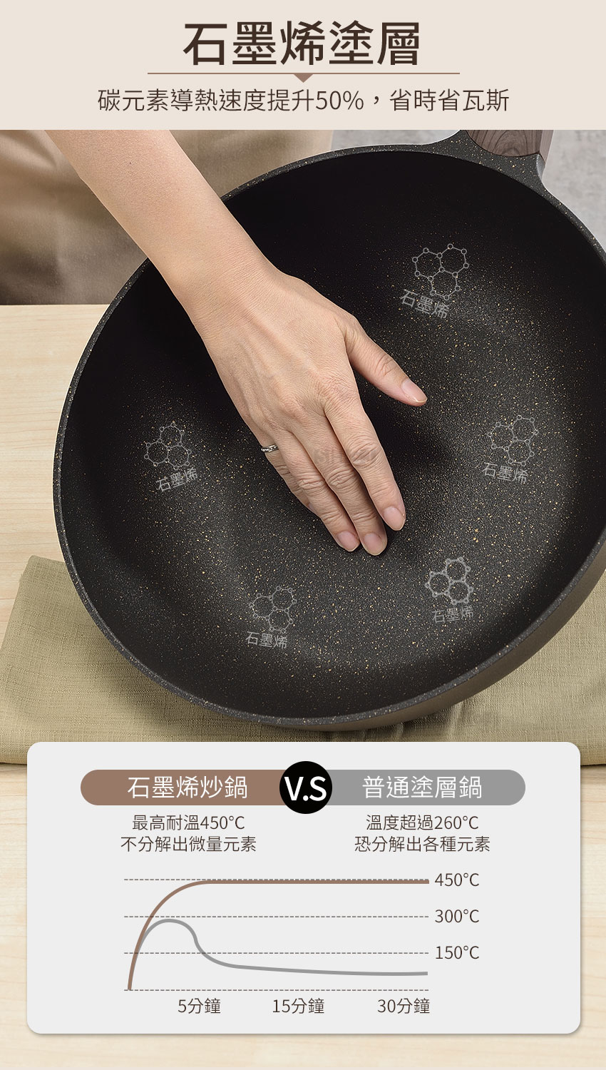 健康、美好的一天~就從生活采家不沾系列料理鍋具開始!! 做飯...很難嗎??【生活采家不沾鍋具系列】-石墨烯岩紋不沾炒鍋32cm,輕量化鋁質合金,添加石墨烯導熱塗層,導熱效能提升50%,熱鍋快速且均勻,節能省時最佳首選;單把設計, 下鍋或起鍋烹煮時輕鬆移動無負擔;一日三餐不能缺少的鍋子,做飯炒菜完全沒問題!!