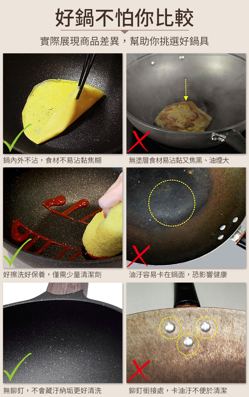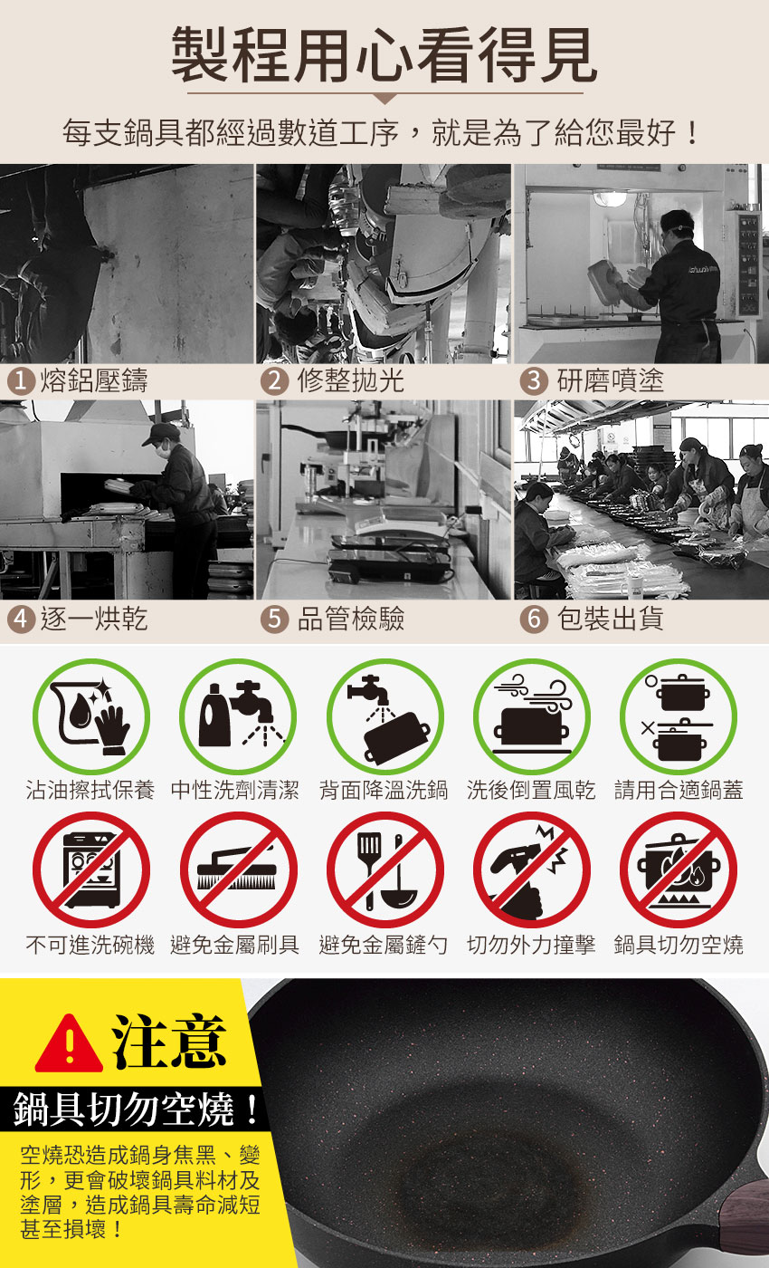 注意事項: 1.請勿重摔或高處掉落,以免商品受損。 2.首次使用請先用清水或中性清潔劑清洗後再使用。 3.商品情境圖片僅供參考,實際出貨不含週邊道具及配件。 4.清洗時請勿使用鋼刷或含有金屬材質之清潔工具刷洗,以免刮傷塗層。 5.為長期保有不沾特性,強烈建議請使用不沾鍋專用鍋鏟或木製鍋鏟。 6.避免使用堅硬、尖鋭或金屬製鍋鏟或大火空燒等,以免損壞塗層。