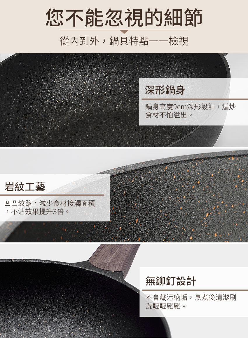 ◆鍋徑32cm、鍋深9cm,煎、炒、煮等完全沒問題。 ◆不鏽鋼飾片,讓鍋具整體更添質感,廚房也是您的時尚舞台。 ◆添加石墨烯塗層,導熱效能提升50%,熱鍋更快、更均勻。 ◆鍋內外均採用特殊岩紋凹凸工法,凹凸紋路減少食材附著不沾黏。 ◆烹煮食物只需極少的油,熱鍋後,調小瓦斯火量更加節能。 ◆單柄取鍋或移鍋都相當方便,附吊孔,清洗後也可吊掛收納風乾。 ◆鍋身整體高壓高密度精密鑄造一體成型,鍋體厚實穩固,不易變形。 ◆烹煮食物無需大油量,熱鍋後調成中小火,烹煮快速又節能。 ◆鍋身與手把接合處無鉚釘固定,烹飪時不易卡油漬,好清潔無死角。 ◆大面積20cm導磁複底利於熱源傳導,可用IH電磁爐、瓦斯爐、電爐、黑晶爐等。