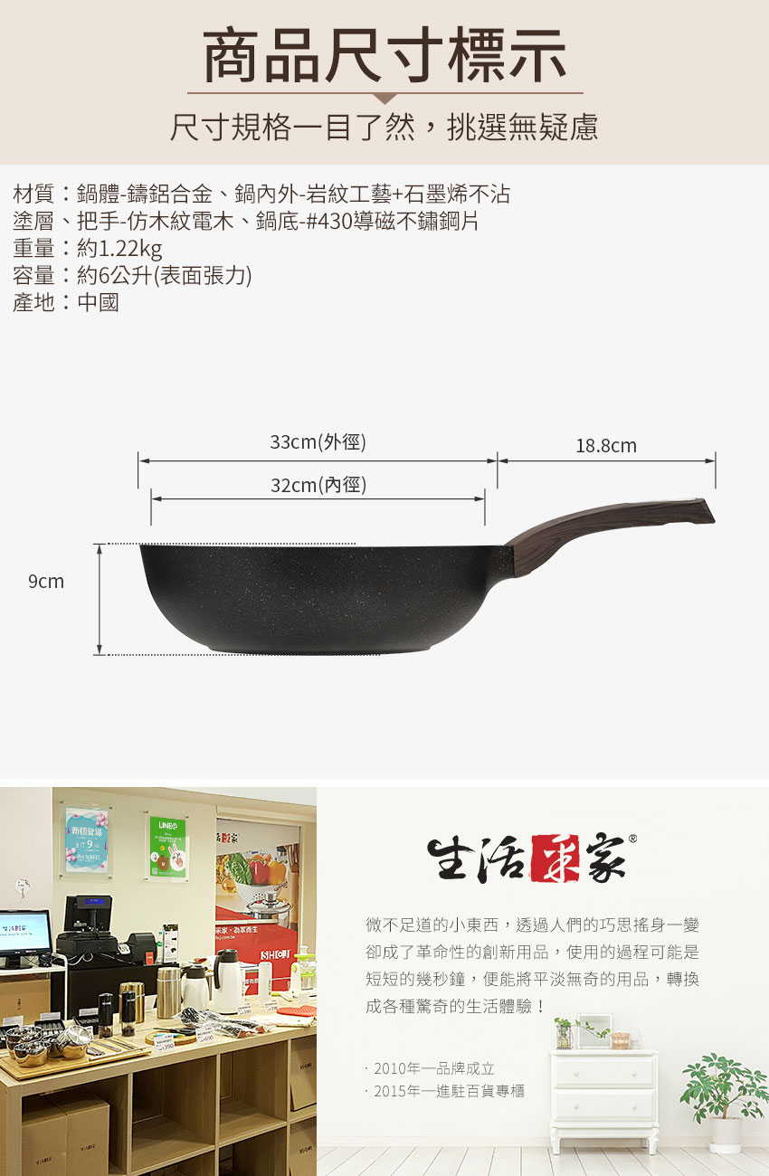 健康、美好的一天~就從生活采家不沾系列料理鍋具開始!! 做飯...很難嗎??【生活采家不沾鍋具系列】-石墨烯岩紋不沾炒鍋32cm,輕量化鋁質合金,添加石墨烯導熱塗層,導熱效能提升50%,熱鍋快速且均勻,節能省時最佳首選;單把設計, 下鍋或起鍋烹煮時輕鬆移動無負擔;一日三餐不能缺少的鍋子,做飯炒菜完全沒問題!!