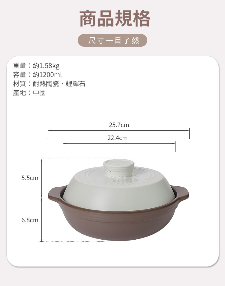 1.尺寸:約W25.7*L22.4*H12.3cm 2.材質:耐熱陶瓷、鋰輝石 3.容量:約1200ml 4.重量:約1.58kg 5.產地:中國 6.適用:瓦斯爐、卡式爐、休閒爐
