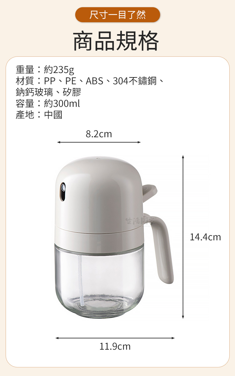 1.尺寸:約長8.2*寬11.9*高14.4cm 2.材質:PE、ABS、PP塑料、304不鏽鋼、鈉鈣玻璃、矽膠 3.容量:約300ml/入 4.重量:約235g/入 5.產地:中國 6.適用:食用油、醬油、醋、料酒等 7.商品:玻璃噴油壼300ml*3