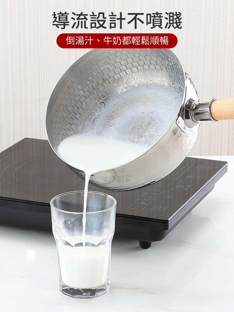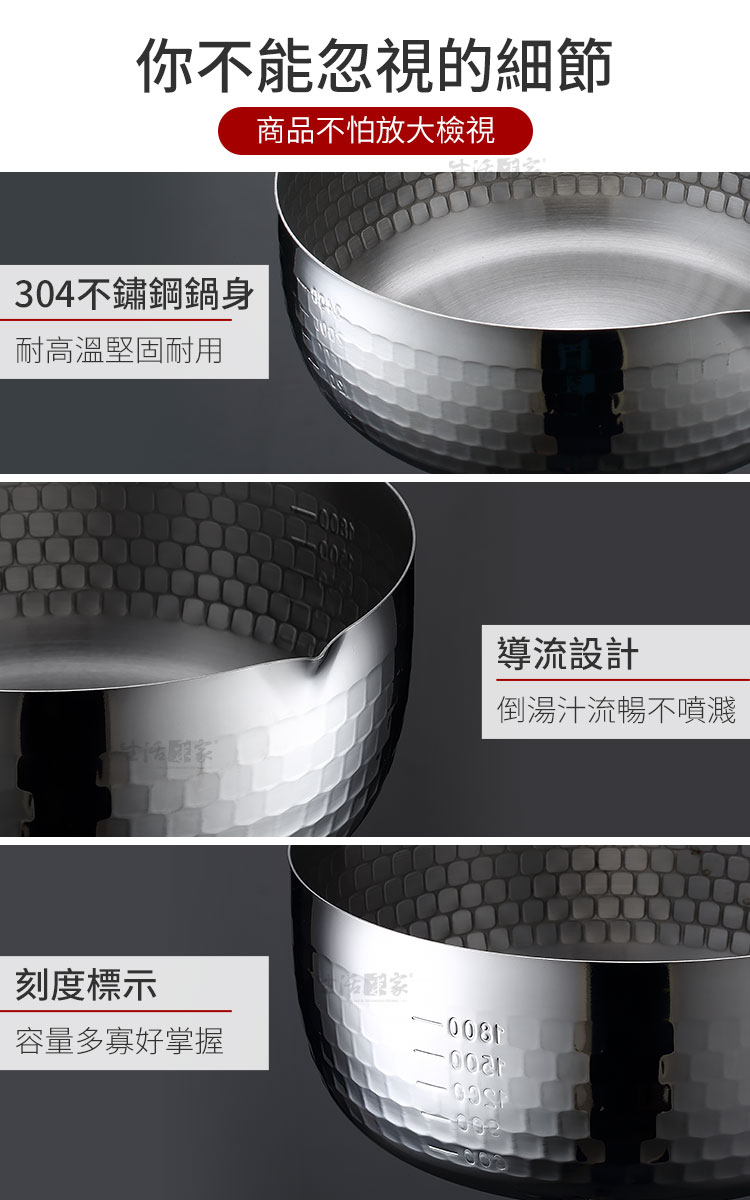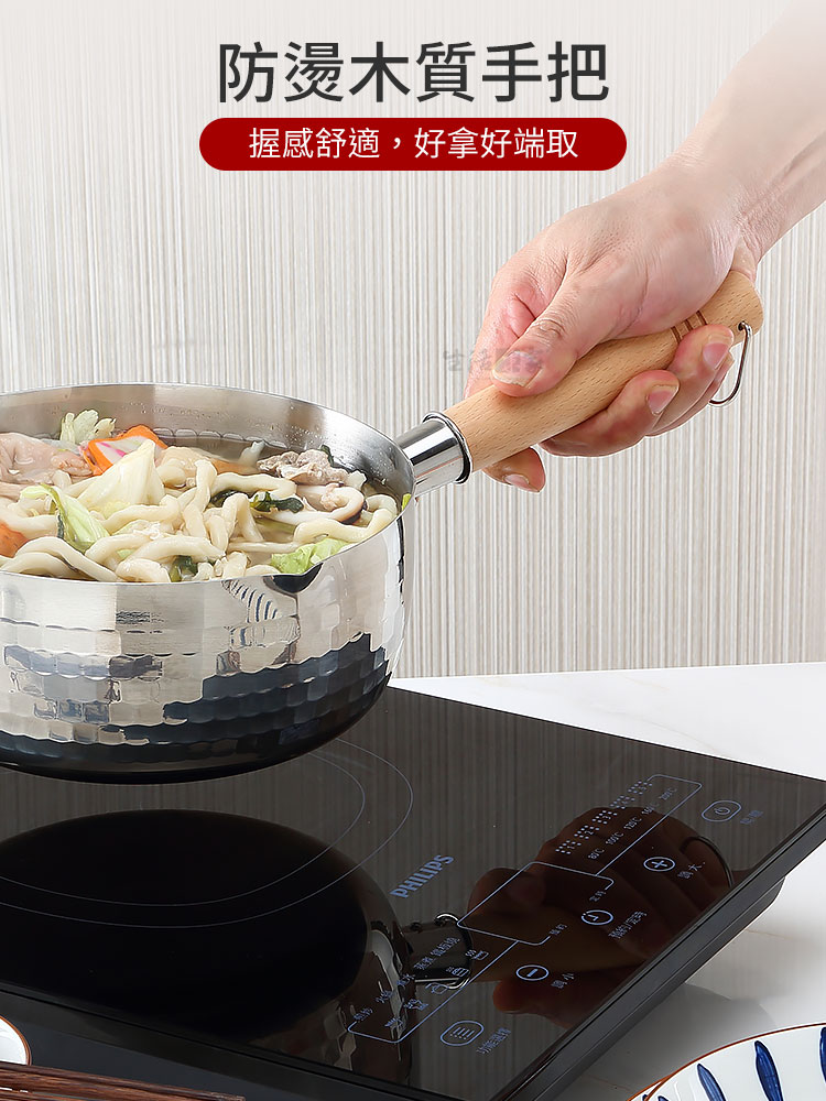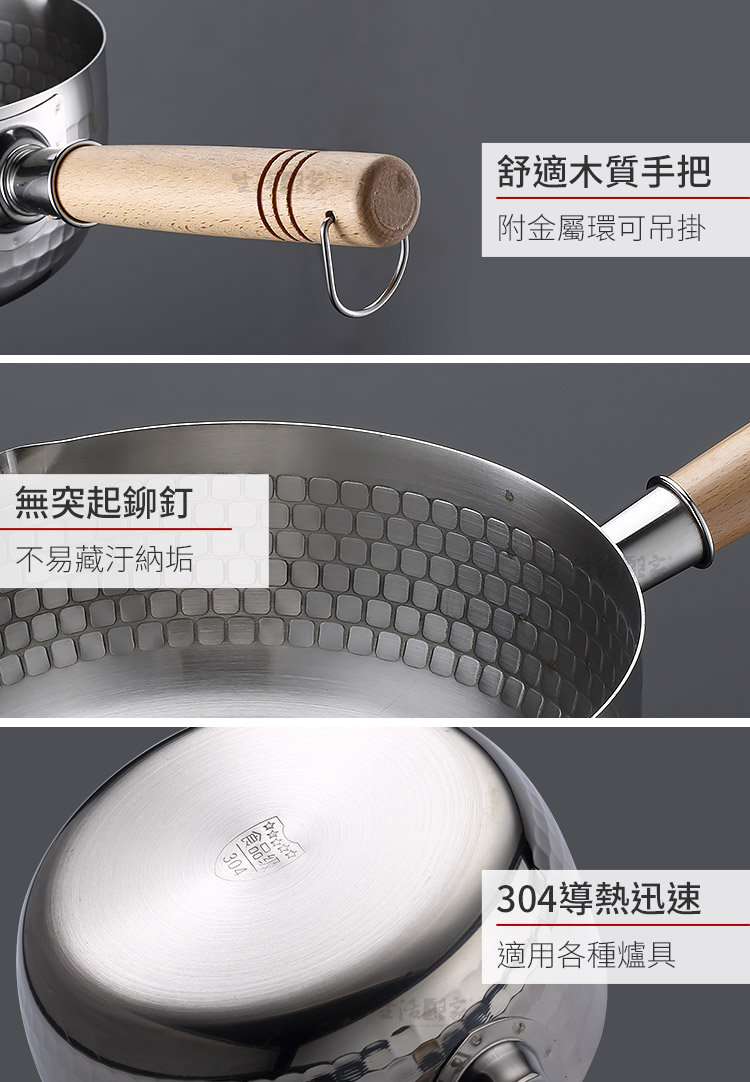 ◆鍋徑:18cm。 ◆材質經SGS檢驗合格,食安沒問題。 ◆煮多煮少,各種尺寸,大小容量剛剛好。 ◆導流嘴出水設計,倒湯、倒麵超方便。 ◆雙邊導流鍋嘴,左手或右手料理都方便。 ◆錘紋鍋身,湯汁沸騰時往內翻滾不易溢出。 ◆木質手把不易燙手,取鍋移鍋單手即可搞定。 ◆輕巧便利,一鍋多用,煮粥煮湯煮麵煮火鍋都行。 ◆鍋身304不鏽鋼材質,耐高溫不易變形,經久耐用。 ◆重量輕盈,起鍋、下鍋、或移鍋都能單手搞定,超好用。 ◆導磁複底不挑鍋,可用於瓦斯爐、電爐、電磁爐、黑晶爐、IH爐等。