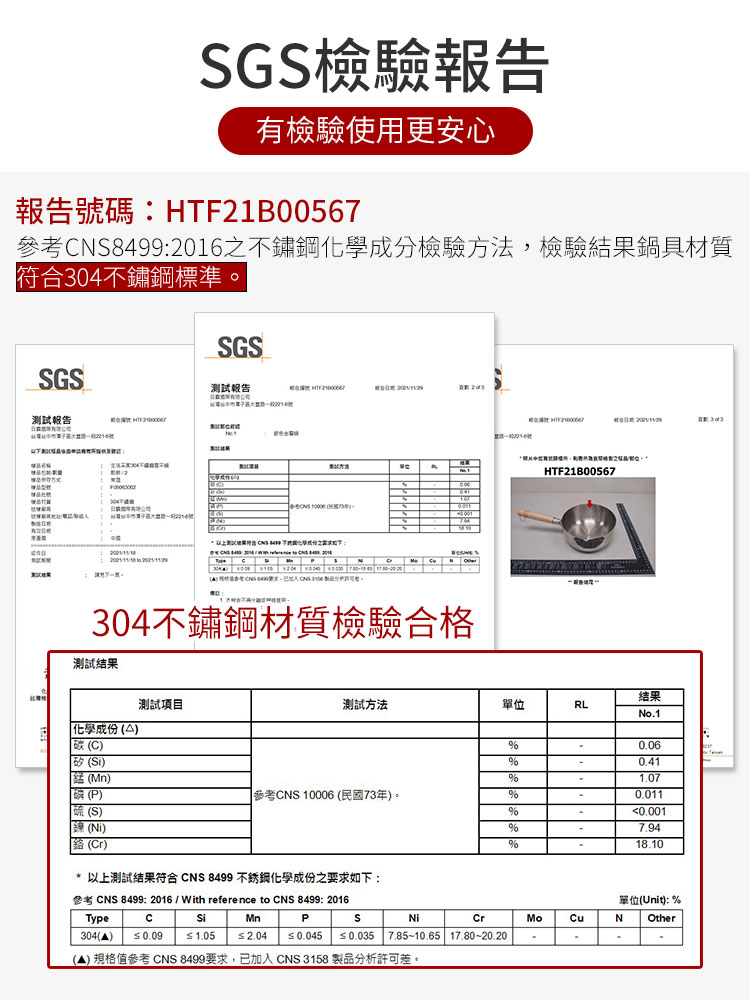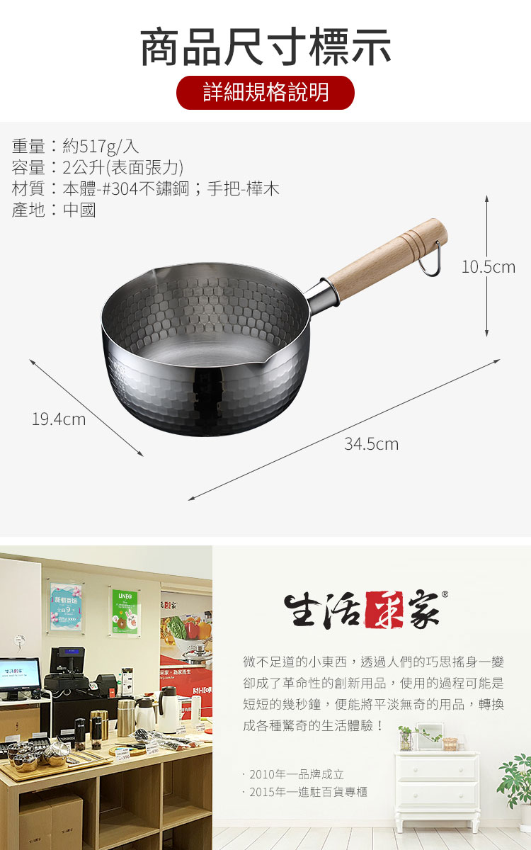 1.鍋徑:18cm 2.尺寸:約長34.5*寬19.4*高10.5cm 3.材質:本體-#304不鏽鋼;手把-樺木 4.容量:2公升(表面張力) 5.重量:約517g/入 6.產地:中國 7.適用:IH爐、電磁爐、瓦斯爐、黑晶爐、陶爐等 8.檢驗:SGS檢驗合格#304不鏽鋼材質(HTF21B00567)