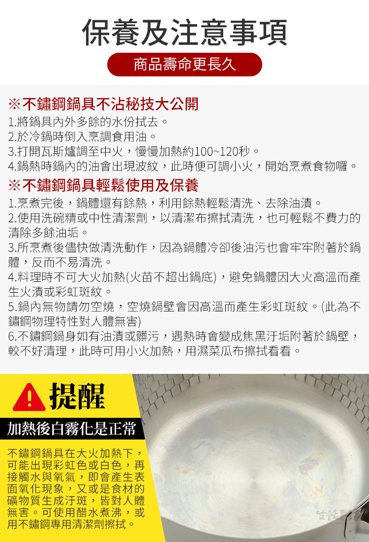 注意事項: 1.請勿重摔或高處掉落,以免商品受損。 2.請勿接近高溫或勿近火源處,以免商品受損。 3.此商品為料理使用,鍋內無物時,請勿空燒。 4.商品情境圖片僅供參考,實際出貨不含週邊道具及配件。 5.如需使用在IH爐,請先確定爐內感應線圈是否小於16cm,否則無法使用。 6.購買前請先量測使用區域尺寸,確定無誤再購買以免尺寸不合,敬請謹慎選購。