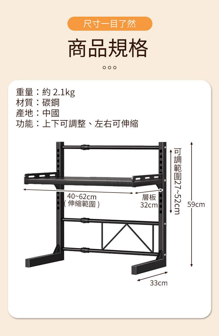1.尺寸:約寬40~62*深33*高59cm 2.材質:碳鋼 3.重量:約2.1kg/組 4.產地:中國 5.組裝:需自行組裝(附組裝說明書) 6.功能:上下可調整、左右可伸縮