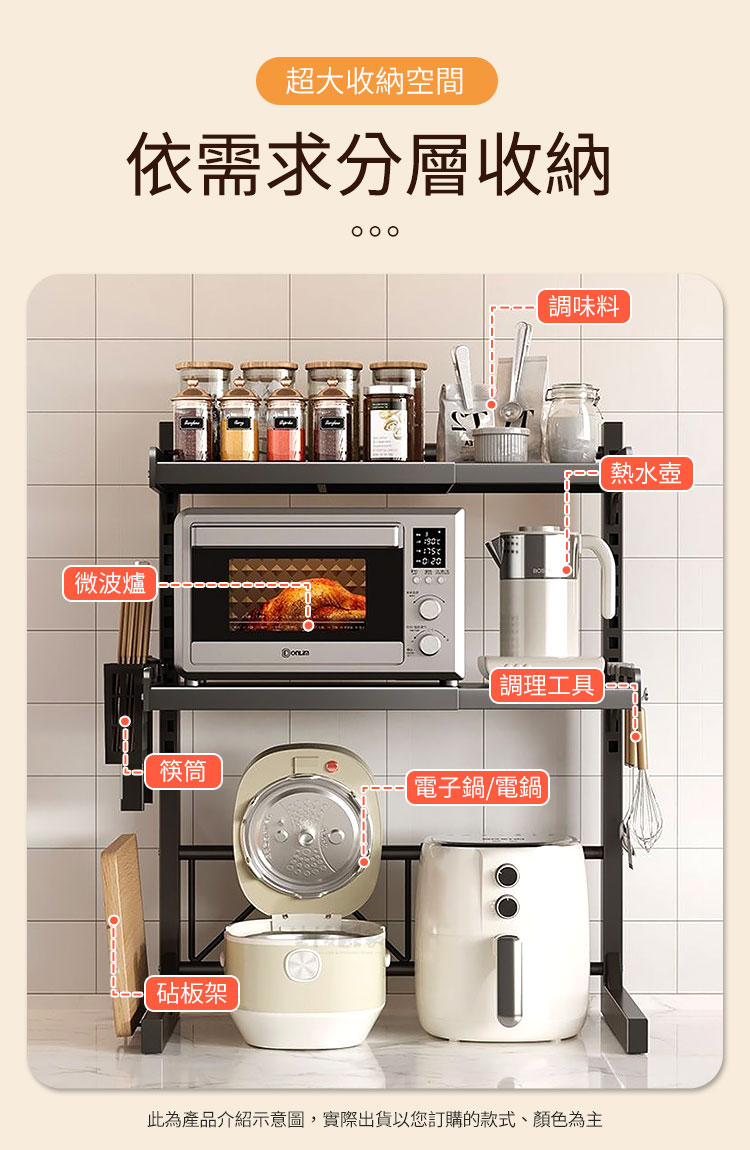 電器用品依需求分層收納,更可以根據電器的高度自由調節層板的位置,讓不同高度的電器也能輕鬆收納,廚房空間更靈活、更加實用!💡🍳 #依需求分層 #廚房實用神器
