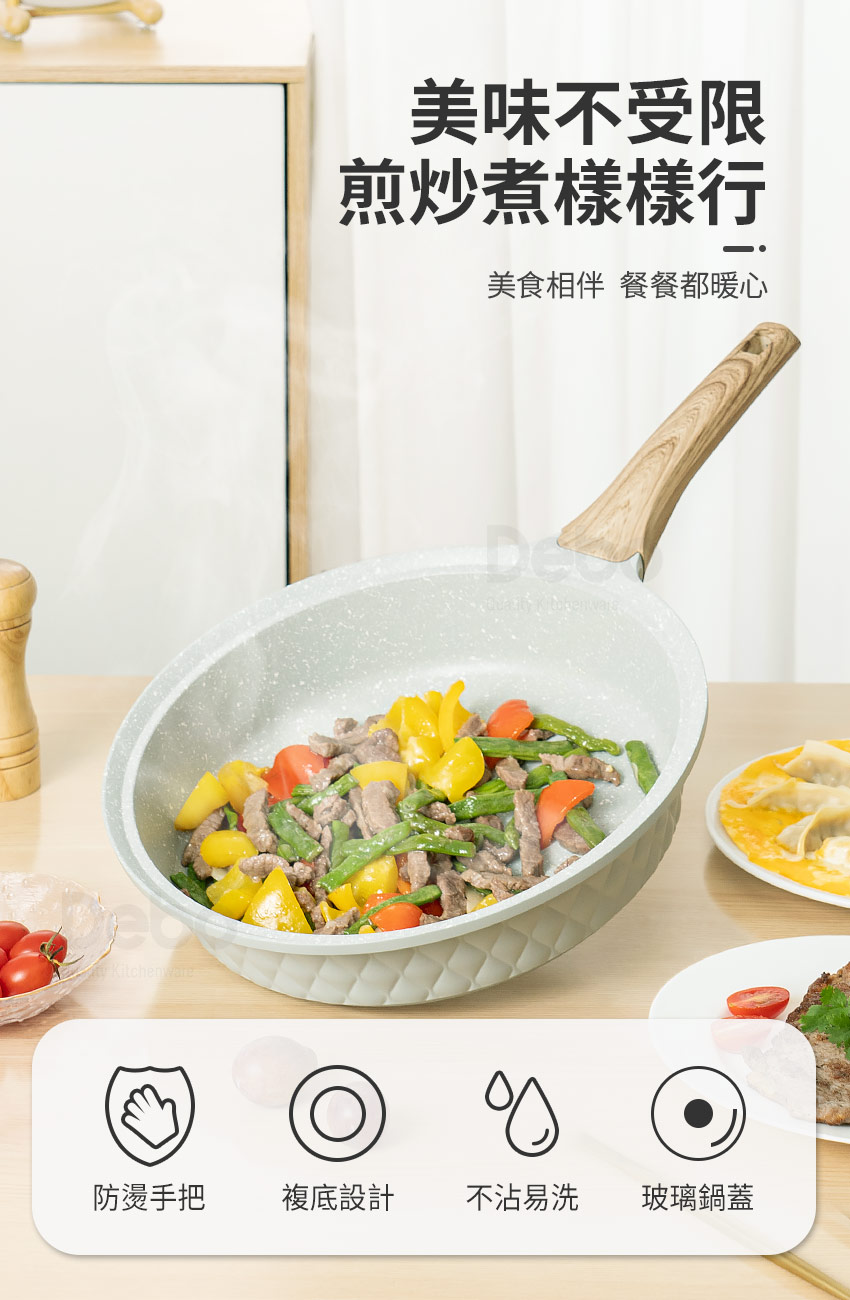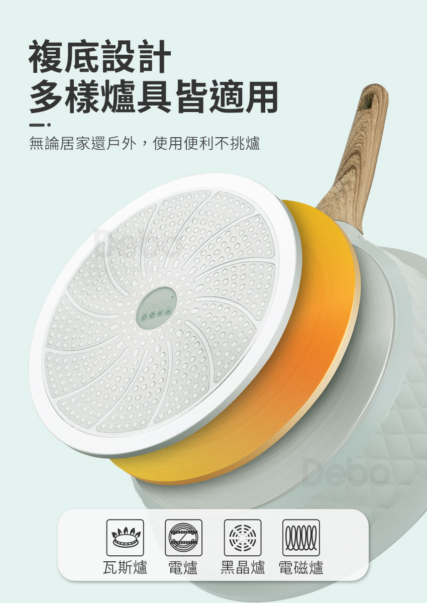 好用、實用、安全的鍋具~【德鉑Debo不沾鍋具系列】終於粉墨登場囉! 真的...選好鍋不如選對鍋~ 想要燒得一手好菜,鍋具是免不了的,有了得心應手的鍋具,料理一道美味可口的好菜就不是一件難事,【德鉑Debo不沾鍋具系列】~單把複底平底鍋,導熱快速 ,重量輕盈,讓您在料理時移鍋更快速 ;單把設計下鍋或起鍋都很便利,烹煮時輕鬆移動無負擔,絕對是您的料理不可缺少的好鍋具!
