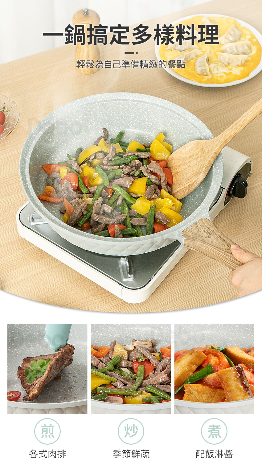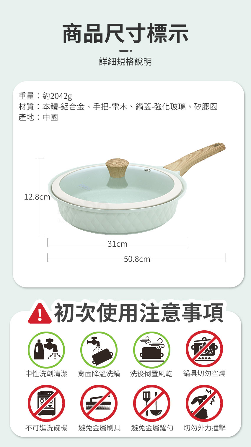 注意事項: 1.請勿重摔或高處掉落,以免商品受損。 2.請勿接近高溫或勿近火源處,以免商品受損。 3.此商品為料理使用,鍋內無物時,請勿空燒。 4.商品情境圖片僅供參考,實際出貨不含週邊道具及配件。 5.購買前請先量測使用區域尺寸,確定無誤再購買以免尺寸不合,敬請謹慎選購。
