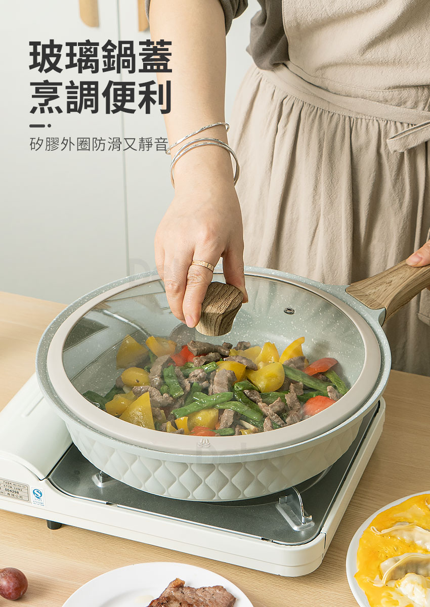 ◆鍋徑28cm,煎、炒、煮等完全沒問題。 ◆日常料理,炒菜、煎肉、煎魚、海鮮等通通ok。 ◆透明鋼化玻璃蓋,烹煮過程一目了然,食材變化看得見。 ◆鍋蓋邊緣採耐熱矽膠圈,悶鍋效果良好,無金屬碰撞聲。 ◆大平面鍋體,可煎煮多種的食材;鍋蓋附透氣孔,可排出蒸氣。 ◆鍋身整體高壓高密度精密鑄造一體成型,鍋體穩固不易變形。 ◆鍋身重量輕盈,起鍋、下鍋、或移鍋都能雙手搞定超好用。 ◆鍋身與手把接合處無鉚釘固定,烹飪時不易卡油漬,好清潔無死角。 ◆導磁複底不挑鍋,可用於瓦斯爐、電爐、IH爐、電磁爐、黑晶爐等。 ◆適用一般家庭、單身貴族、租屋族、學生族群、喜愛下廚的朋友們...等。