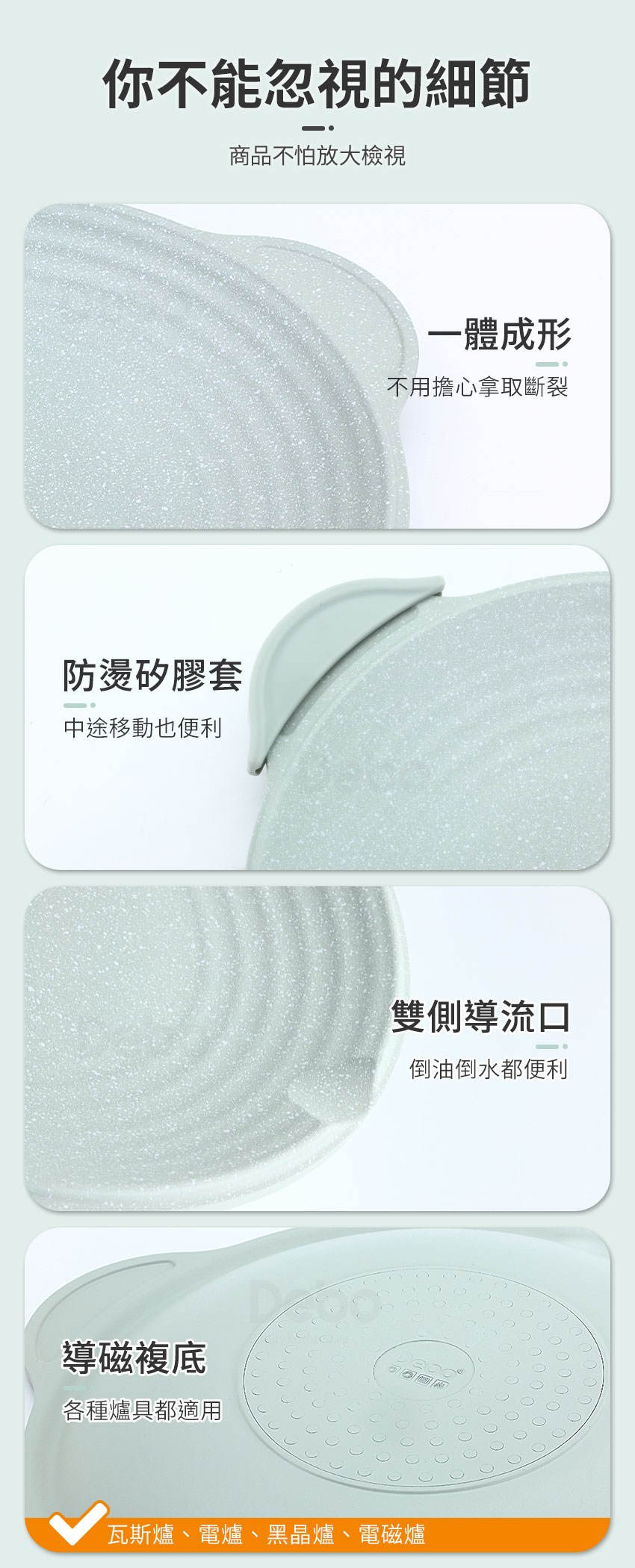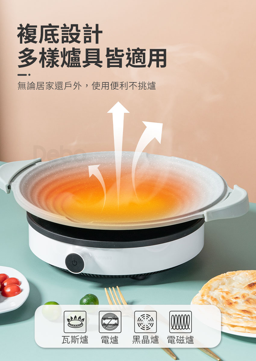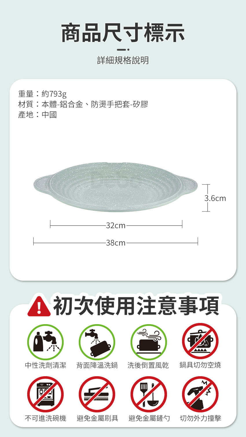 1.尺寸:約長38*寛36*高3.6cm 2.材質:本體-鋁合金、防燙手把套-矽膠 3.重量:約793g 4.產地:中國 5.適用:IH爐、電磁爐、瓦斯爐、黑晶爐、陶爐等