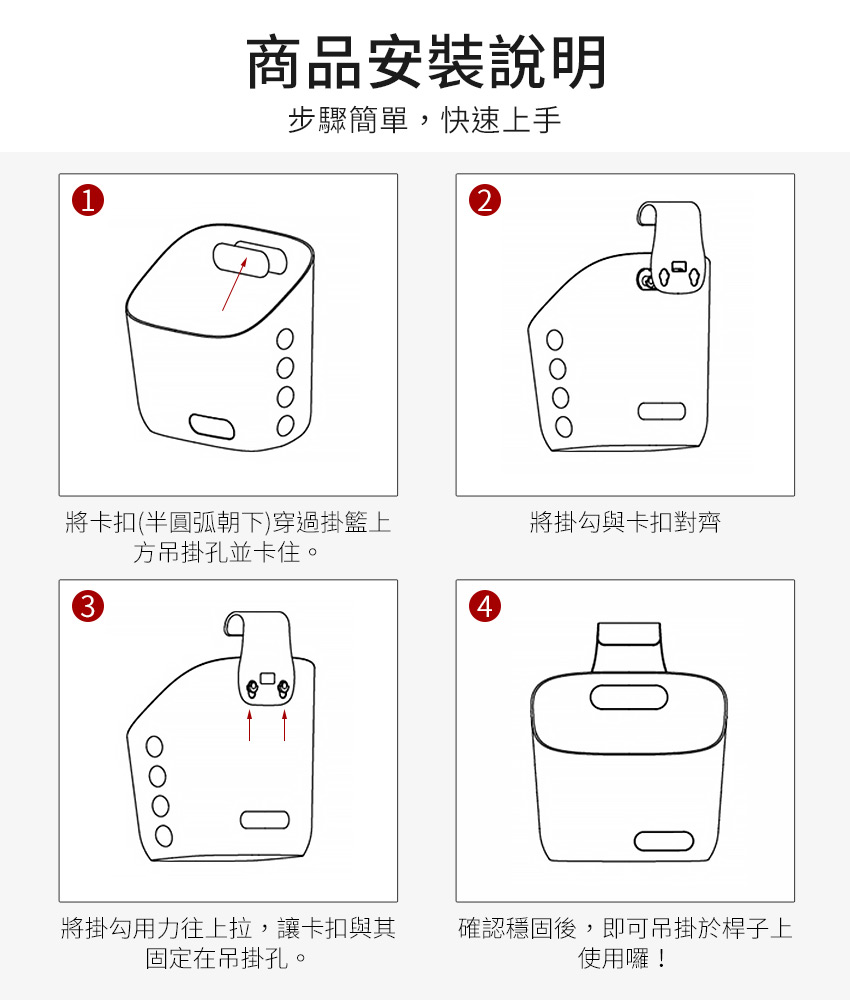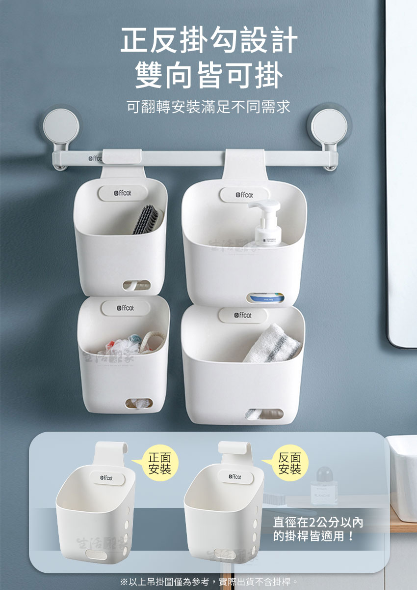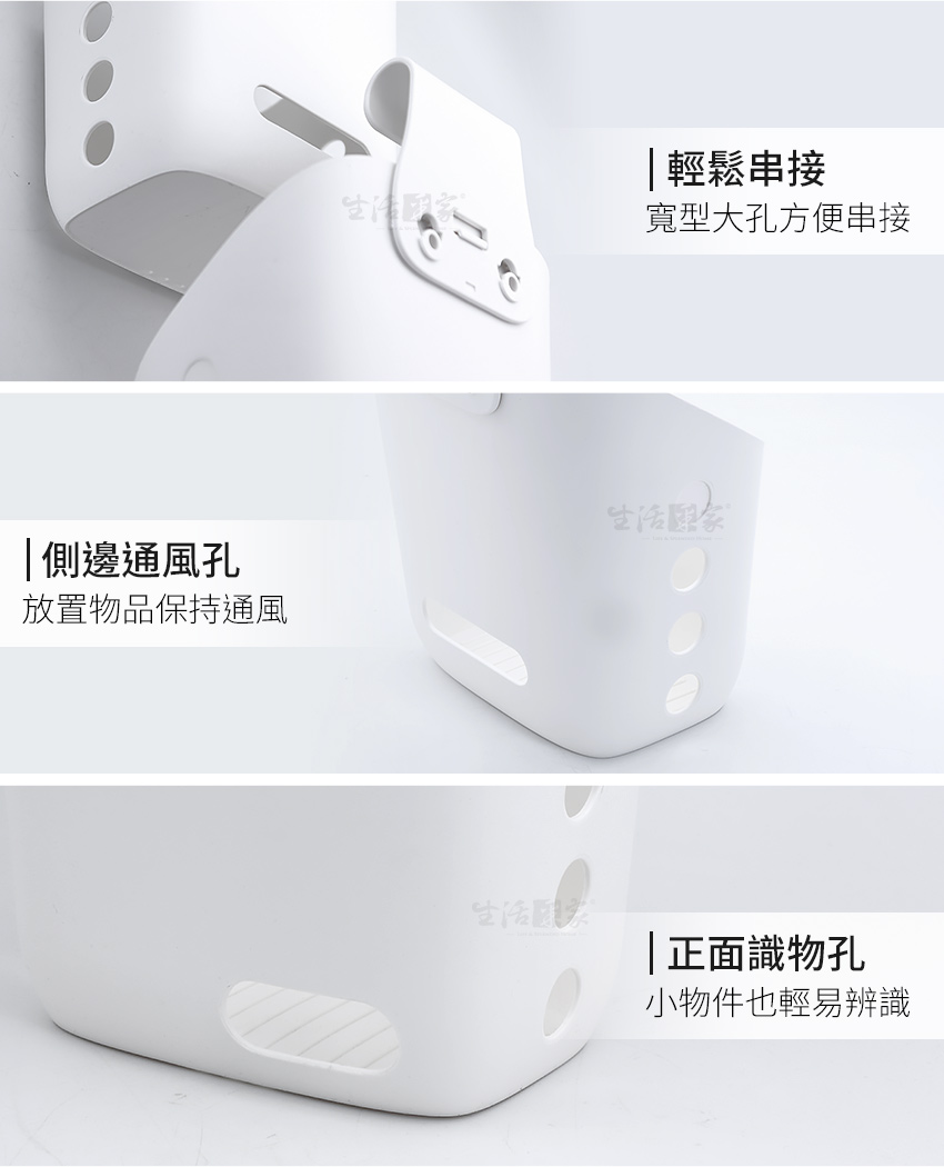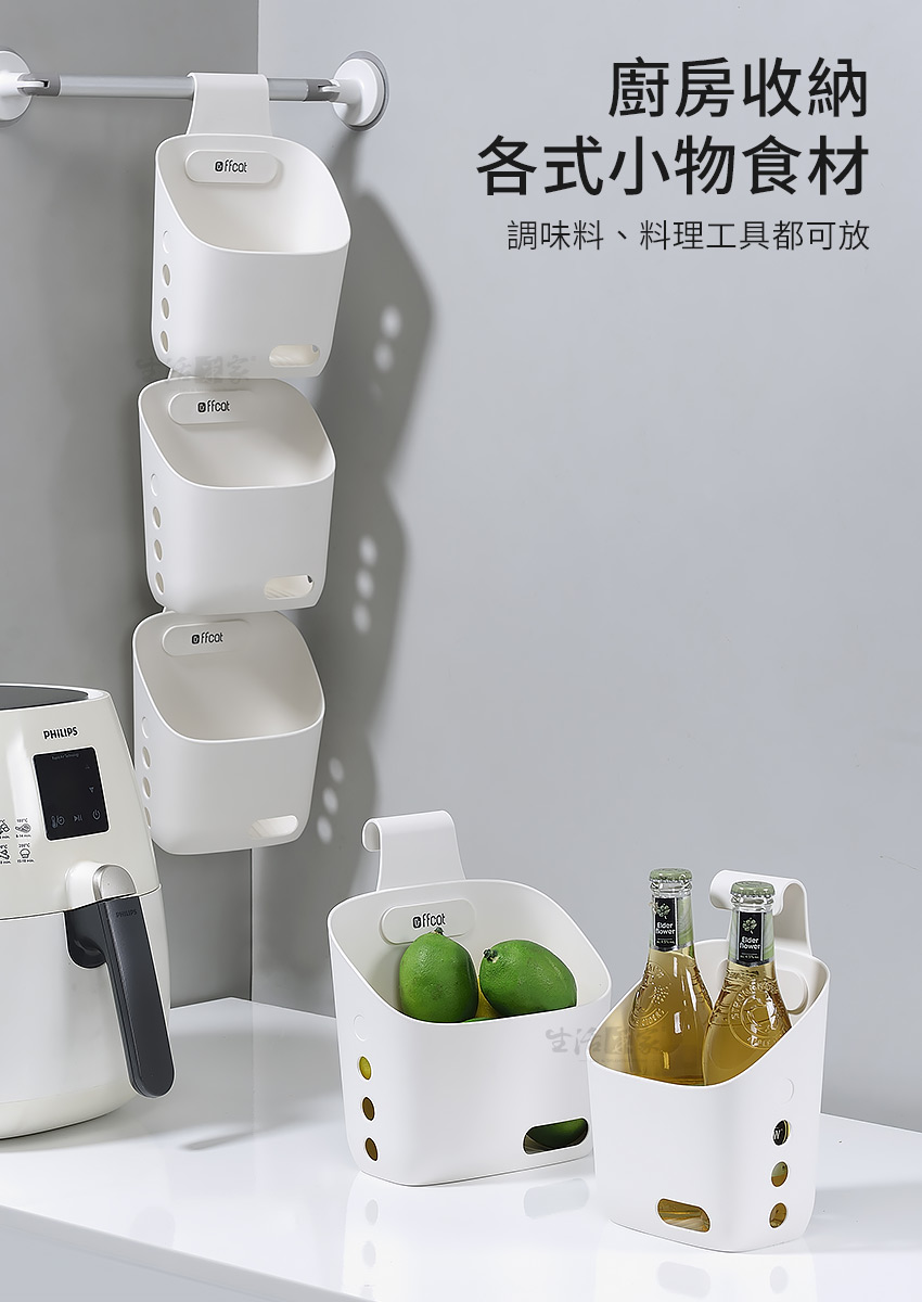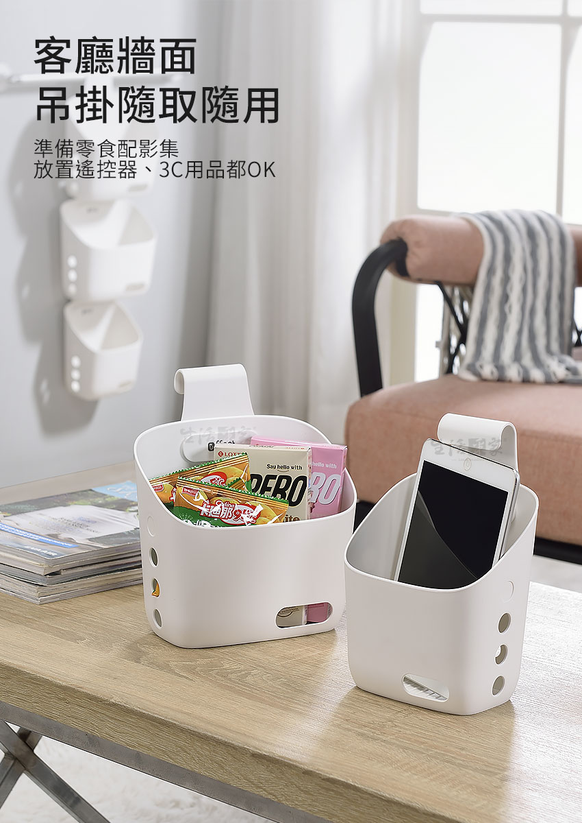 ◆生活與美學的結合,我就是要美美的。 ◆加寬型掛勾適用2cm內的掛桿,正掛、反掛都可用。 ◆串連懸掛,減少空間浪費,充份利用壁面垂直空間。 ◆採用加厚PP耐衝擊塑料,用料好、品質佳、超耐用。 ◆傾斜式設計,底部瀝水孔,放置物品時也不怕積水。 ◆側面通風孔,正面識物孔,清楚了解收納物品種類。 ◆多功能收納,可放置個人物品、廚房小物、浴室用品等。 ◆居家廚房、浴室或辦公室、倉庫、民宿、營業場所適用。