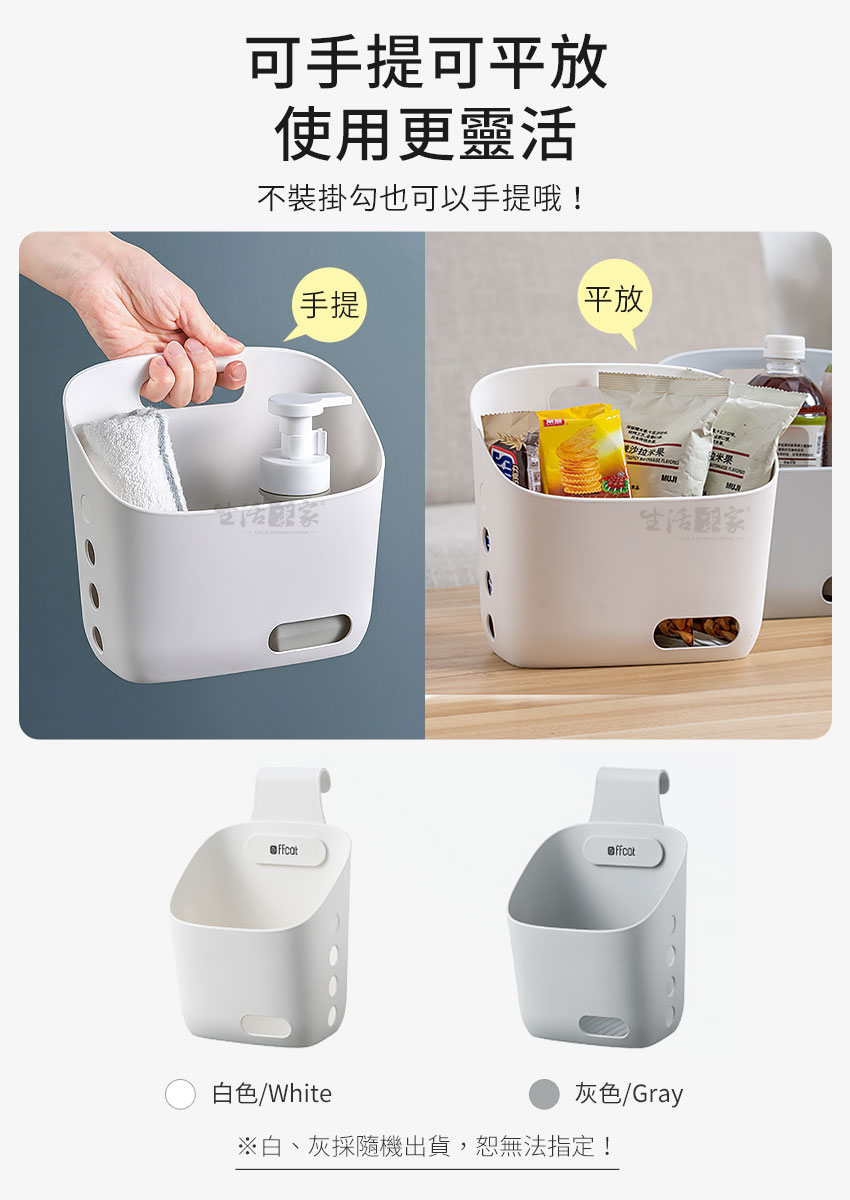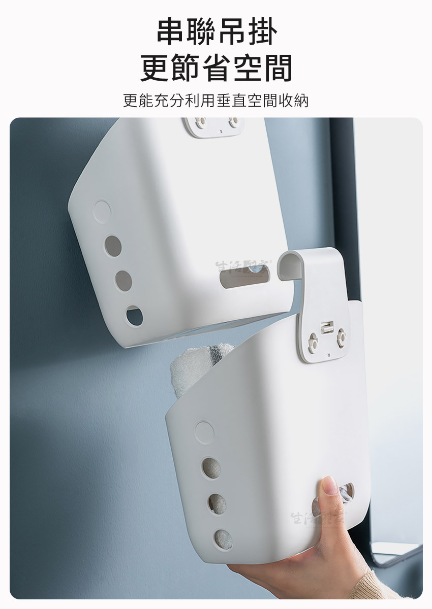 ◆生活與美學的結合,我就是要美美的。 ◆加寬型掛勾適用2cm內的掛桿,正掛、反掛都可用。 ◆串連懸掛,減少空間浪費,充份利用壁面垂直空間。 ◆採用加厚PP耐衝擊塑料,用料好、品質佳、超耐用。 ◆傾斜式設計,底部瀝水孔,放置物品時也不怕積水。 ◆側面通風孔,正面識物孔,清楚了解收納物品種類。 ◆多功能收納,可放置個人物品、廚房小物、浴室用品等。 ◆居家廚房、浴室或辦公室、倉庫、民宿、營業場所適用。