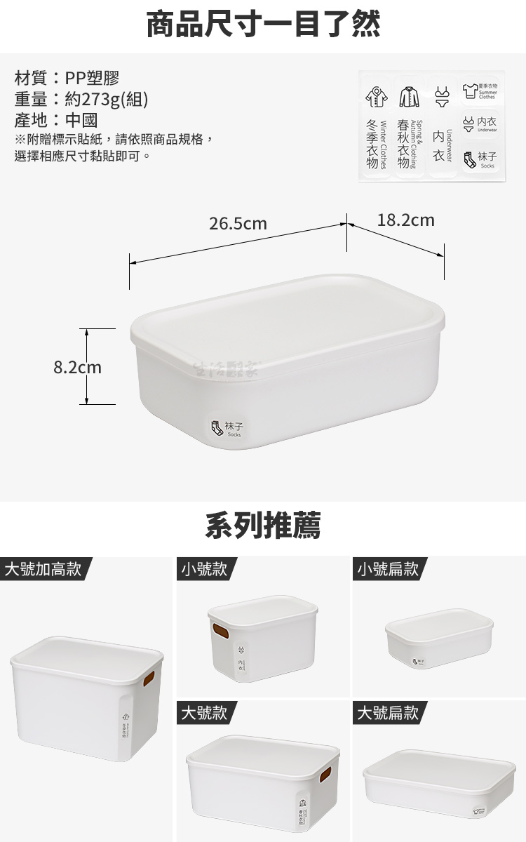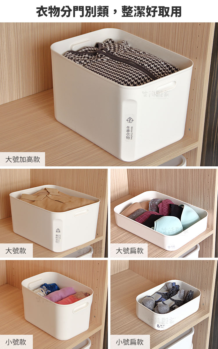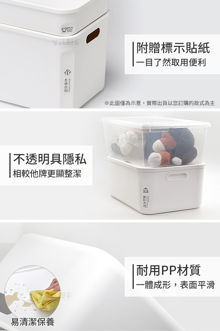 ◆生活與美學的結合,我就是要美美的。 ◆恰到好處的家居收納,為簡約生活增添樂趣。 ◆附蓋防塵,不僅乾淨衛生,更有個人儲物隱私。 ◆大號小號款均可互相堆疊擺放,充份利用室內垂直空間。 ◆本體為PP塑料,用料實在無異味,長期使用也不易變形。 ◆可搭配臥室衣櫃、書櫃、各式櫥櫃或置於後車廂收納雜物。 ◆貼心名條設計,就像用標籤找物,清楚了解收納的物品種類。 ◆日系風格、啞光純白、簡約時尚,使用時相當搭配室內裝潢。 ◆大小容量分類,居家卧室衣物收納或是公司工廠樣品收納,都很方便。