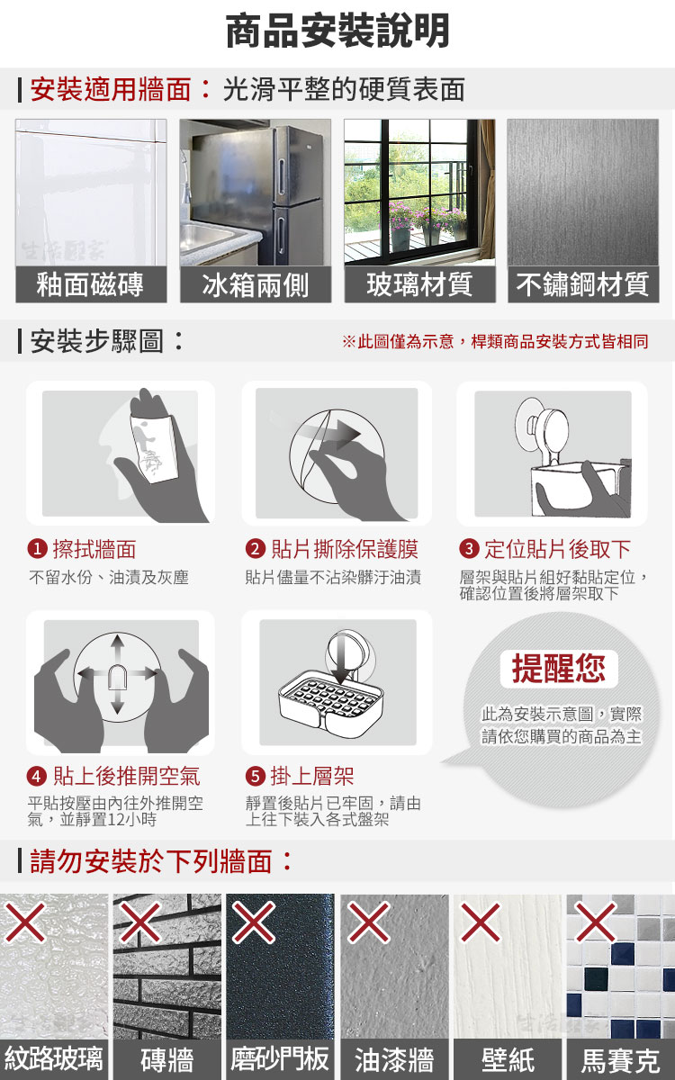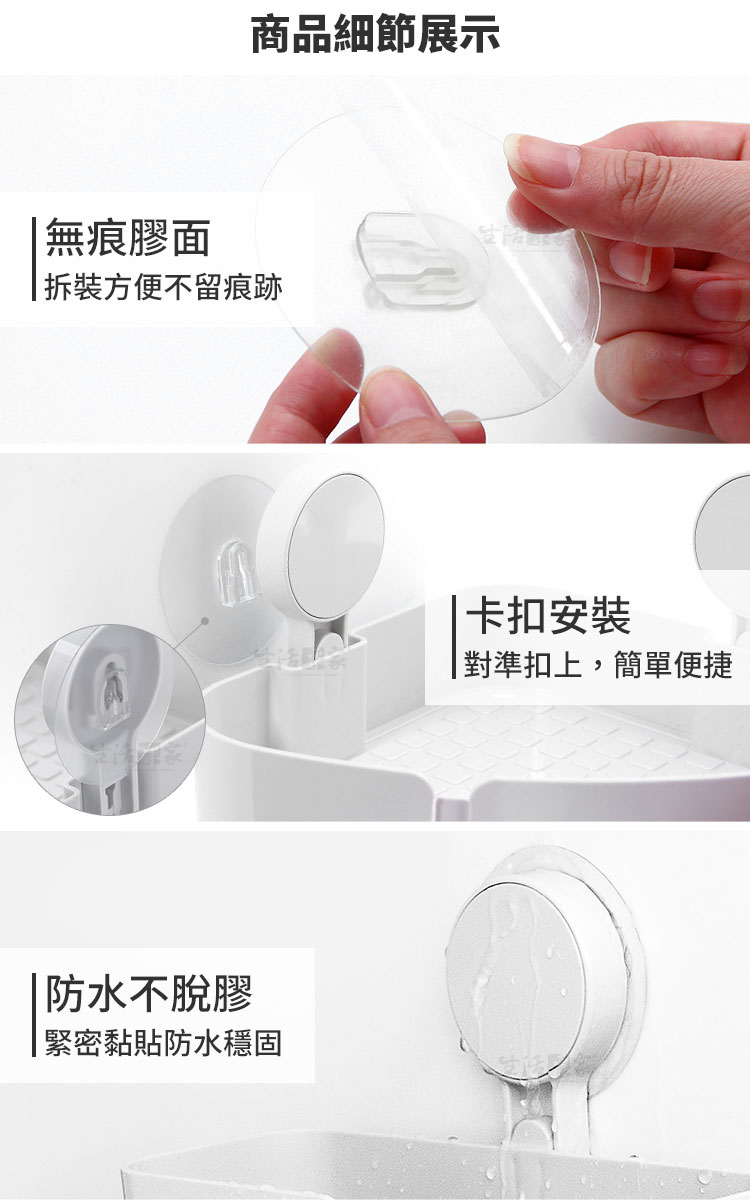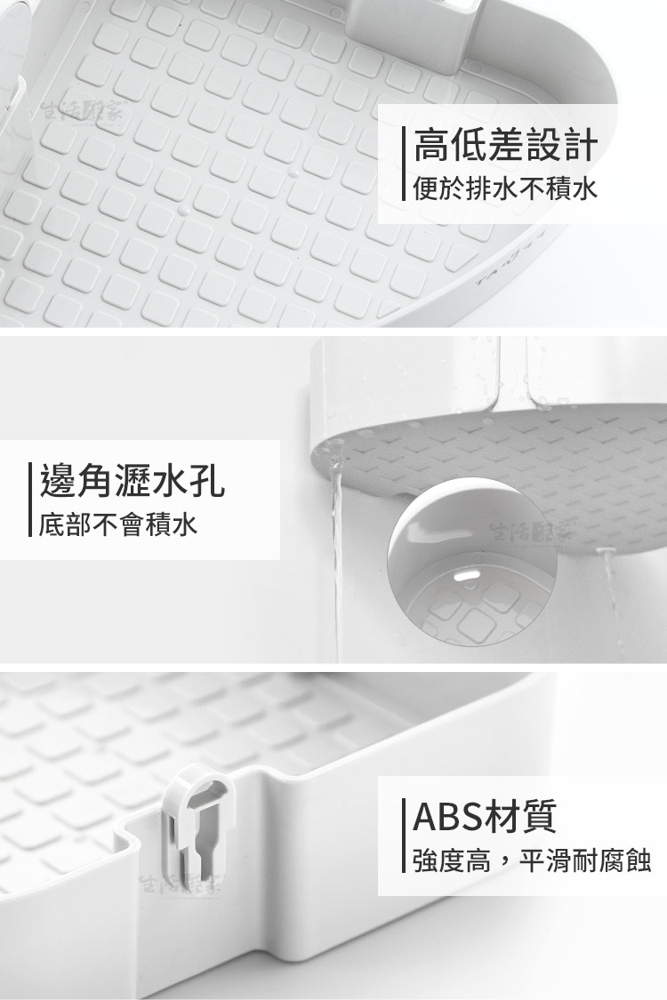 ◆生活與美學的結合,我就是要美美的。 ◆安裝在壁面可節省空間,台面從此不凌亂、不潮濕。 ◆無痕黏貼,免打孔免打釘免鑽孔,與牆面緊緊相依。 ◆本體關節採卡扣式固定,對準扣上即可,簡單便捷。 ◆三角架造型,角落空間也不錯過,充份運用收納空間。 ◆可擺放各式盥洗用品,如沐浴乳、洗髮精、洗面乳等。 ◆盤面凸點設計,空氣流通,乾燥快速,乾淨衛生。 ◆底部設有3個排水孔,盤面不積水,物品不泡水。 ◆本體採用ABS工程級塑膠,用料好品質佳,經久耐用。 ◆強力無痕貼,結實牢固遇水不脫落,承重佳不易掉落。 ◆居家廚房、浴室或辦公室、倉庫、民宿、營業場所適用。 ◆黏貼於光滑平整硬質表面,安拆便利,撕貼不留痕跡。 ◆適用玻璃、光滑磁磚、不鏽鋼板、壓克力板、PVC板等牆面。