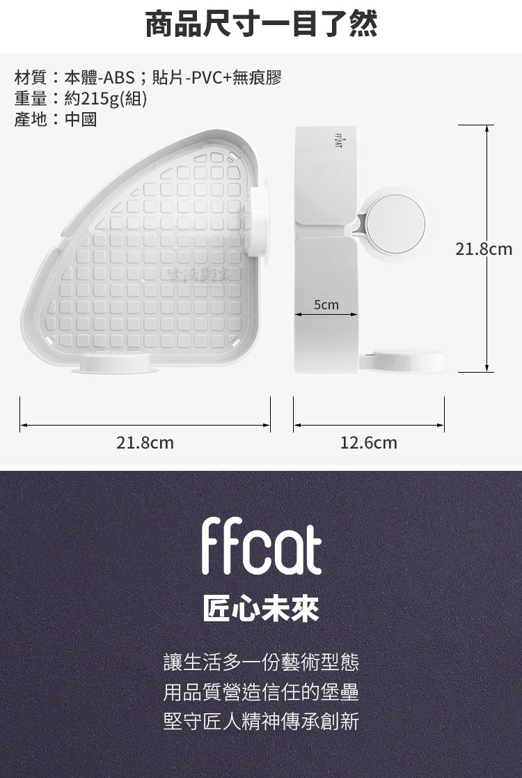 1.尺寸:約寬21.8*深21.8*高12.6cm 2.材質:本體-ABS塑膠、貼片-PVC+無痕膠 3.重量:約215g 4.顏色:灰白 5.產地:中國 6.適用:光滑平整硬質表面 7.入數:2入