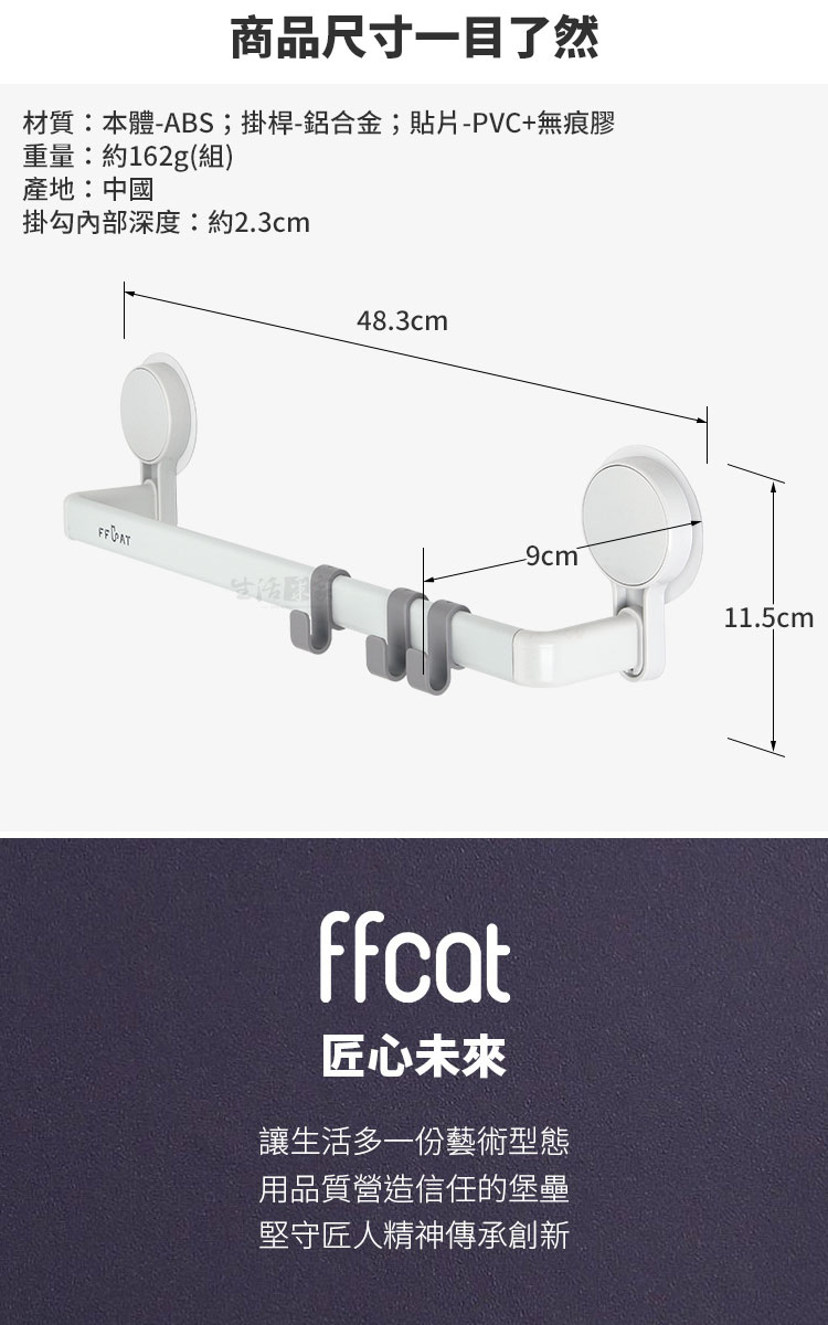 1.尺寸:約寬48.3*深9*高11.5cm 2.材質:本體-ABS塑膠、掛桿-鋁合金、貼片-PVC+無痕膠 3.重量:約162g 4.顏色:灰白 5.產地:中國 6.適用:光滑平整硬質表面 7.入數:2入