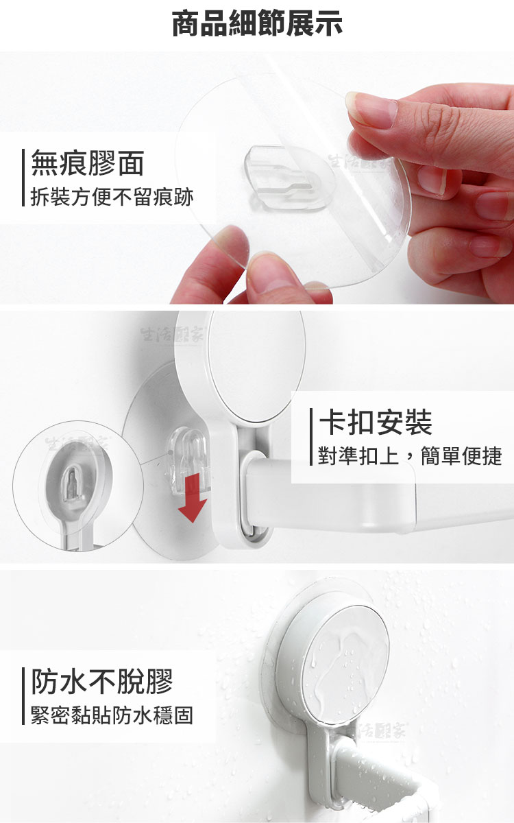 ◆生活與美學的結合,我就是要美美的。 ◆安裝在壁面可節省空間,台面從此不凌亂、不潮濕。 ◆無痕黏貼,免打孔免打釘免鑽孔,與牆面緊緊相依。 ◆本體關節採卡扣式固定,對準扣上即可,安裝便捷。 ◆採用ABS工程級塑膠+輕量鋁桿,用料好品質佳經久耐用。 ◆桿式用途,在浴室可掛擦手巾、毛巾或沐浴清潔小物等。 ◆強力無痕貼,結實牢固遇水不脫落,承重佳不易掉落。 ◆居家廚房、浴室或辦公室、倉庫、民宿、營業場所適用。 ◆黏貼於光滑平整硬質表面,安拆便利,撕貼不留痕跡。 ◆適用玻璃、光滑磁磚、不鏽鋼板、壓克力板、PVC板等牆面。