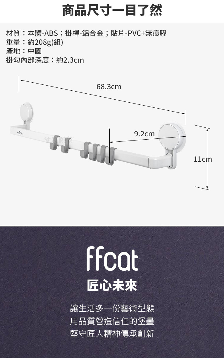 1.尺寸:約寬68.3*深9.2*高11cm 2.材質:本體-ABS塑膠、掛桿-鋁合金、貼片-PVC+無痕膠 3.重量:約208g 4.顏色:灰白 5.產地:中國 6.適用:光滑平整硬質表面 7.入數:2入