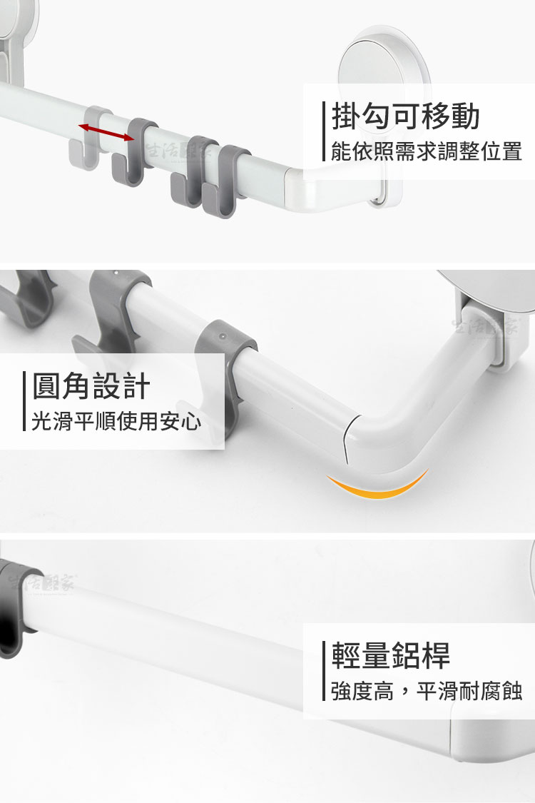 ◆生活與美學的結合,我就是要美美的。 ◆安裝在壁面可節省空間,台面從此不凌亂、不潮濕。 ◆無痕黏貼,免打孔免打釘免鑽孔,與牆面緊緊相依。 ◆本體關節採卡扣式固定,對準扣上即可,安裝便捷。 ◆採用ABS工程級塑膠+輕量鋁桿,用料好品質佳經久耐用。 ◆長型桿式用途,在浴室可掛擦手巾、毛巾或沐浴清潔小物等。 ◆強力無痕貼,結實牢固遇水不脫落,承重佳不易掉落。 ◆居家廚房、浴室或辦公室、倉庫、民宿、營業場所適用。 ◆黏貼於光滑平整硬質表面,安拆便利,撕貼不留痕跡。 ◆適用玻璃、光滑磁磚、不鏽鋼板、壓克力板、PVC板等牆面。