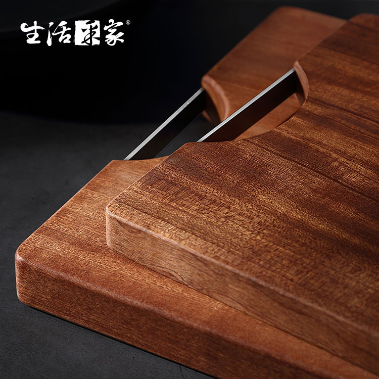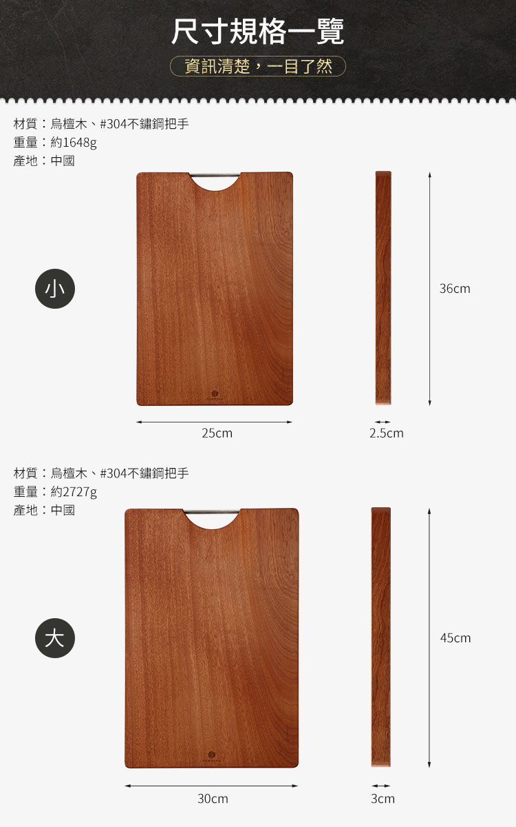 【生活采家】家用小款烏檀木整木加厚長方形砧板#58001 1.尺寸:約長36*寬25*高2.5cm±2% 2.材質:本體-烏檀木;把手-#304不鏽鋼 3.重量:約1648g±2% 4.產地:中國 5.商品:烏檀木小號砧板*1