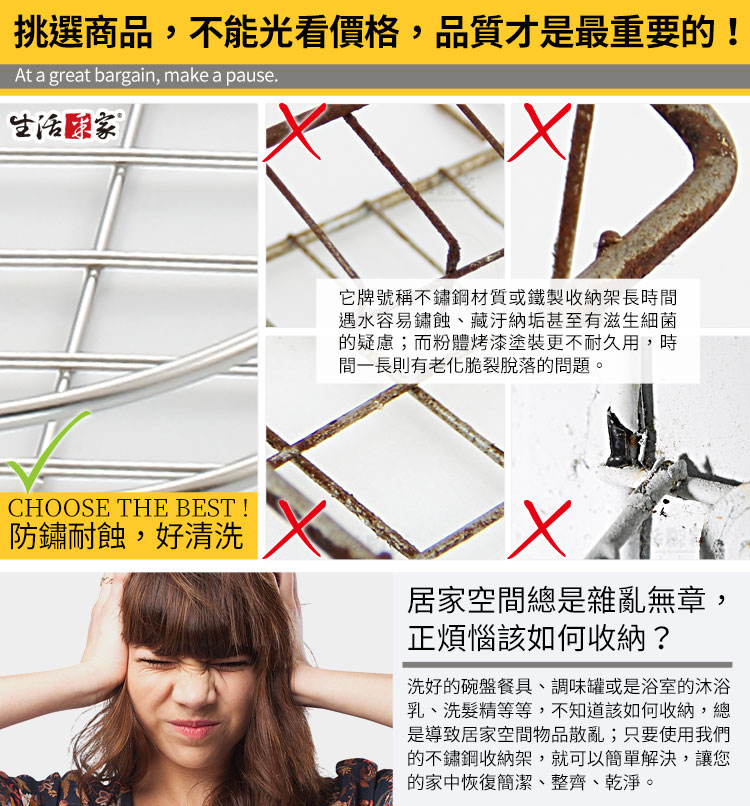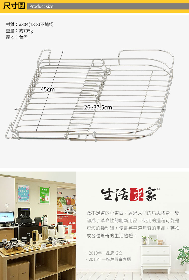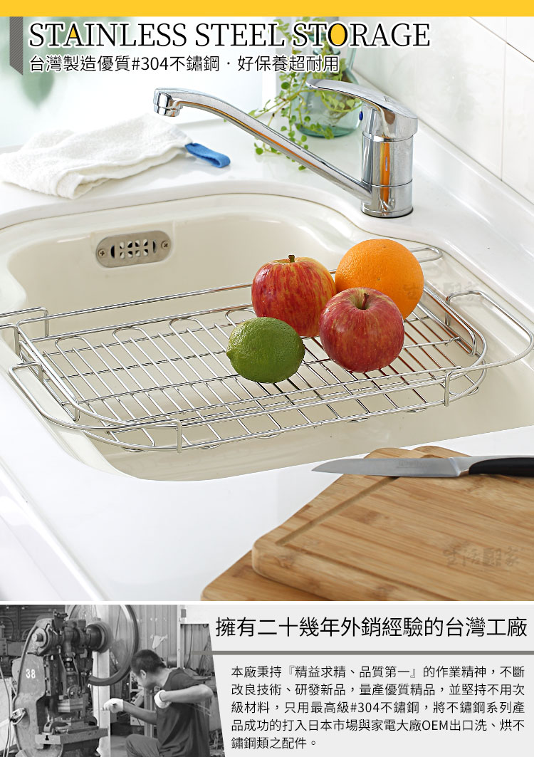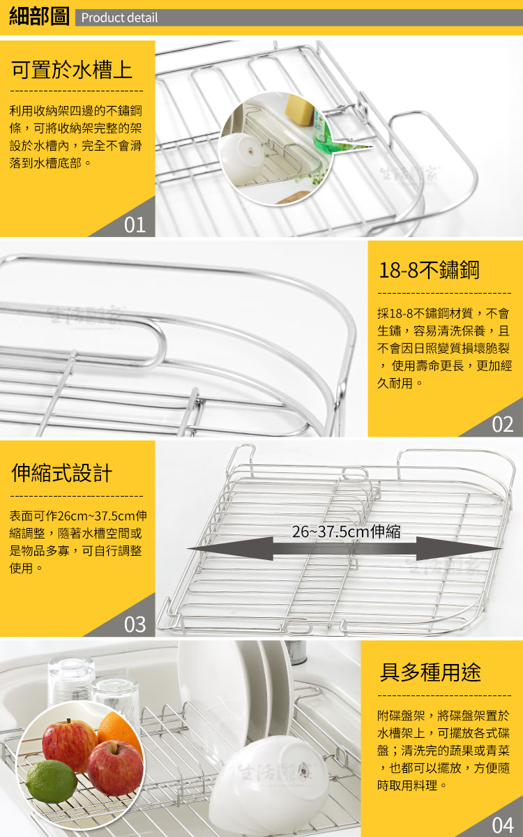 洗完的碗盤、筷子、茶杯要在哪裡瀝乾呢?? ◆採18-8不鏽鋼材質,不會生鏽,容易清洗保養,經久耐用。 ◆不鏽鋼材不電鍍,直採採用不鏽鋼本色,長保如新,衛生可靠。 ◆全架採不鏽鋼材質,不會因日照變質損壞脆裂, 使用壽命更長。 ◆26cm~37.5cm伸縮型設計,可隨著水槽空間自行調整使用。 ◆大面積設計,清洗完畢的碗盤或杯子都可以擺放瀝水風乾。 ◆清洗完的蔬果或青菜,也都可以擺放,方便隨時取用料理。 ◆附碟盤架,將碟盤架置於水槽架上,可擺放各式碟盤。 ◆覺得擺放空間不夠時,伸縮式設計的水槽籃絕對可以解決你的問題。