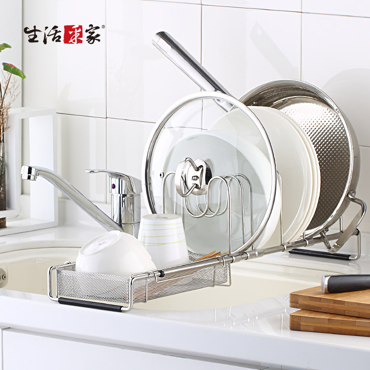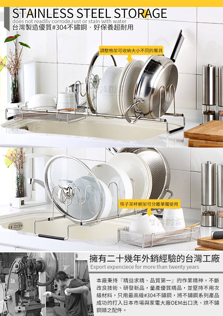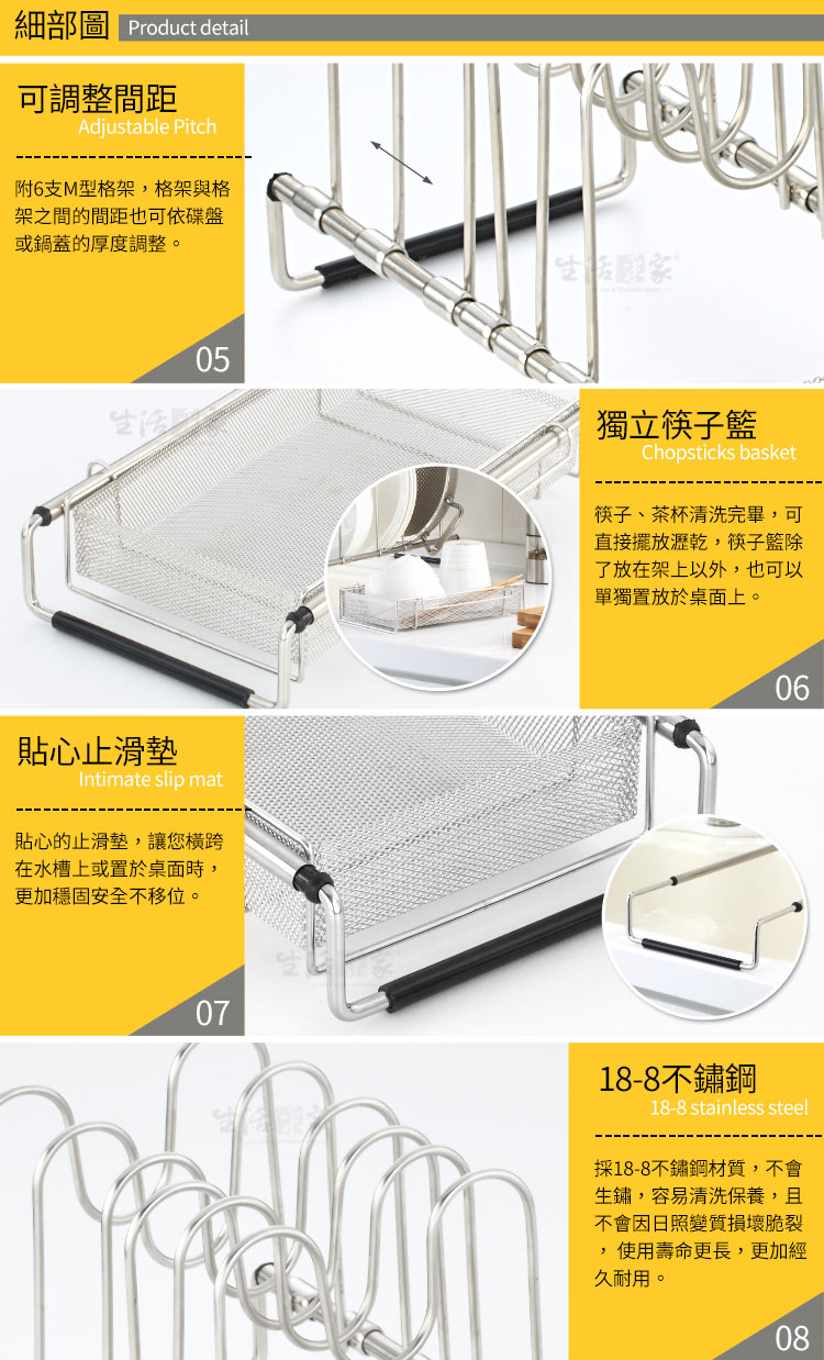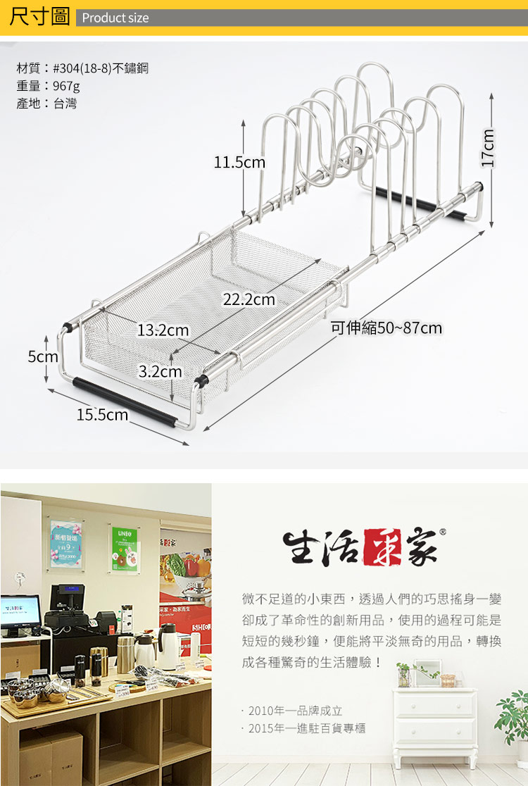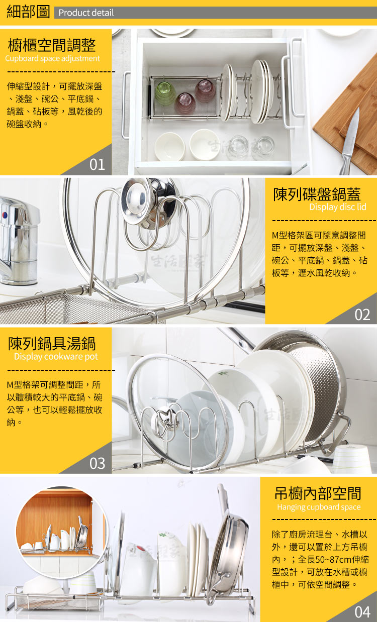 清洗後的碟碗或鍋蓋..要如何收納呢?? ◆採18-8不鏽鋼材質,不會生鏽,容易清洗保養,經久耐用。 ◆不鏽鋼材不電鍍,直採採用不鏽鋼本色,長保如新,衛生可靠。 ◆全架採不鏽鋼材質,不會因日照變質損壞脆裂, 使用壽命更長。 ◆全長50~87cm伸縮型設計,可放在水槽或櫥櫃中,可依空間調整。 ◆附6支M型格架,格架與格架之間的間距也可依碟盤或鍋蓋的厚度調整。 ◆伸縮型設計,可擺放深盤、淺盤、碗公、平底鍋、鍋蓋、砧板等,瀝水風乾收納。 ◆全品採不鏽鋼材質製造,不似塑膠材質易斷裂,耐用好清洗,不易藏污垢。 ◆這麼實用、便利的商品,親愛的媽媽...您絕對不能錯過的收納工具。