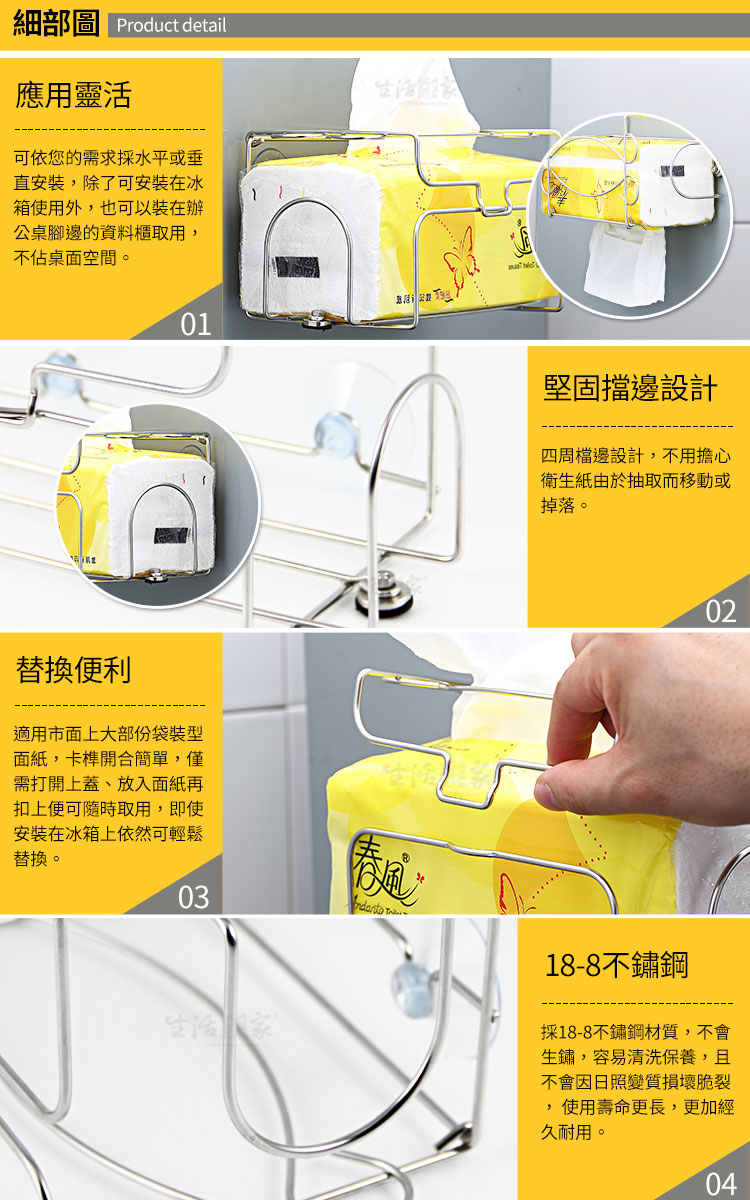 臨時想找個面紙,卻找不到嗎?? ◆可依您的需求採水平或垂直安裝,運用靈活,取用方便。 ◆採18-8不鏽鋼材質,不會生鏽,容易清洗保養,經久耐用。 ◆不鏽鋼材不電鍍,直採採用不鏽鋼本色,長保如新,衛生可靠。 ◆全架採不鏽鋼材質,不會因日照變質損壞脆裂, 使用壽命更長。 ◆適用市面上大部份袋裝型面紙,打開上蓋放入面紙再蓋上,即可取用。 ◆除了可安裝在廚用或冰箱使用外,也可以裝在辦公桌腳邊的資料櫃取用。 ◆吸盤+強力磁鐵安裝,雙重安裝方式更加確保,使用時更加穩固不易掉落。 ◆強力磁鐵(釹鐵錋)可吸附在鐵製物品表面,磁鐵表面有貼保護泡棉,可避免安裝過程因拖拉而產生的刮傷。