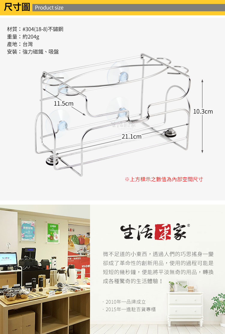 1.尺寸:約寬21.1*深11.5*高10.3cm 2.材質:#304(18-8)不鏽鋼 3.重量:約204g(組) 4.產地:台灣 5.商品:抽取式面紙架*1、強力磁鐵*2(已安裝在架上)、吸盤*4