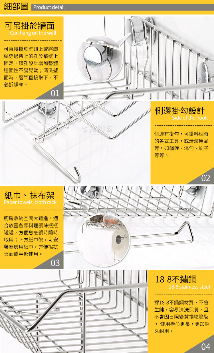廚房收納空間大躍進,調味料罐收納架讓您的廚房更井然有序!! ◆適合放置各類料理調味瓶瓶罐罐,方便您烹調時隨時取用。 ◆附有紙巾架,可安裝廚房用紙巾,方便擦拭桌面或手部使用。 ◆採18-8不鏽鋼材質,不會生鏽,容易清洗保養,經久耐用。 ◆不鏽鋼材不電鍍,直採採用不鏽鋼本色,長保如新,衛生可靠。 ◆全品採不鏽鋼材質製造,不似塑膠材質易斷裂,耐用好清洗,不易藏污垢。 ◆掛鈕式吊掛設計,需要清洗壁面時,可將層架直接取下,不必拆螺絲。 ◆這麼實用、便利的商品,親愛的朋友們...您絕對不能錯過的收納工具。