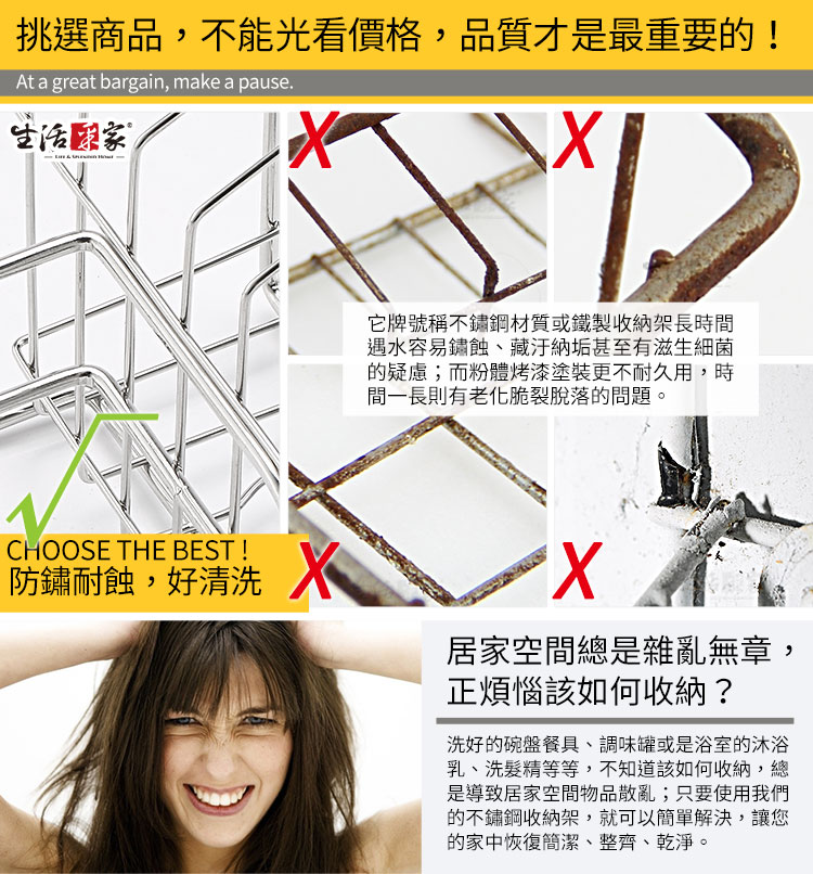 ※SUS304材質,可抗日曬無遇水生鏽問題,SUS304為同質產品最高規格材料,一般不標示材料序號的坊間產品大多是以SUS201或較低階不鏽鋼材所生產的唷~ ※掛鈕的好處:配合鋁鋅合金掛壁鈕安裝在牆面,不會像吸盤有承重掉落問題,安裝方式為將層架掛在鋁鋅合金壁鈕上,日後可以自由取下清潔,沒有拆卸不便的問題。