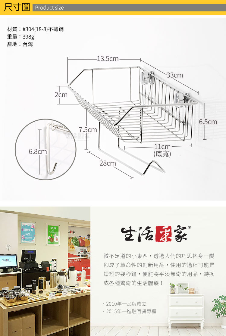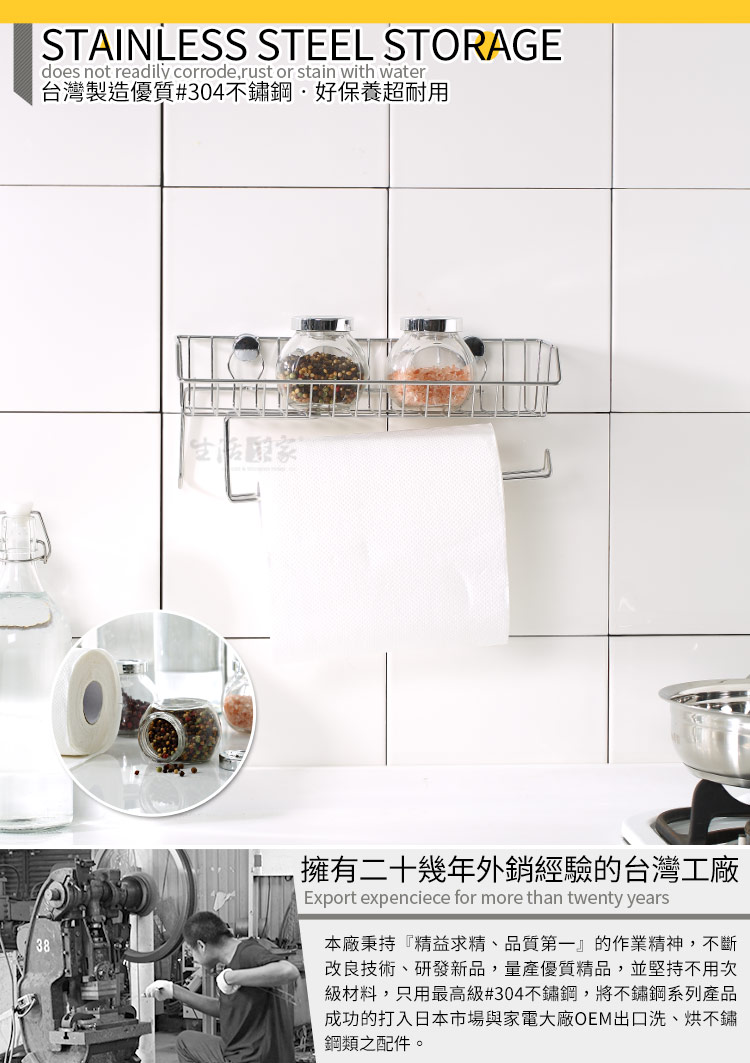 1.尺寸:約寬33*深11cm*高14cm 2.材質:#304(18-8)不鏽鋼 3.重量:約398g(入) 4.產地:台灣 5.商品:調味料紙巾架*1、掛鈕配件包*1