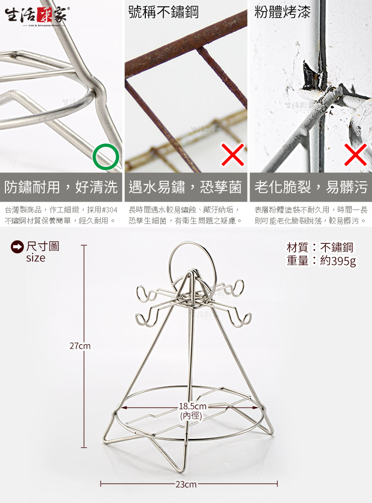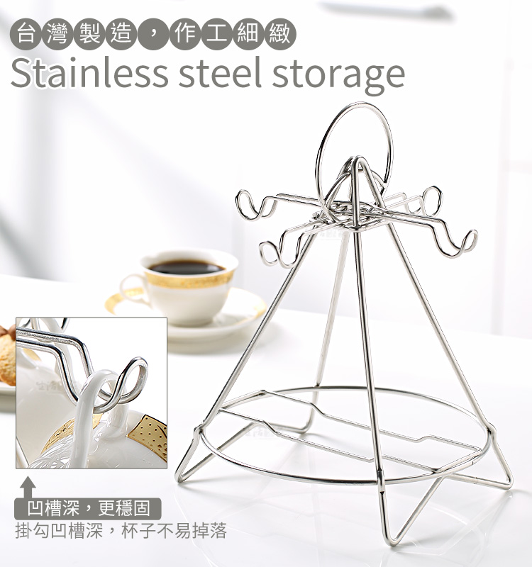 1.尺寸:約直徑23*高27cm(如尺寸圖) 2.材質:#304(18-8)不鏽鋼 3.重量:約395g(入) 4.產地:台灣 5.商品:四人份咖啡杯架*1