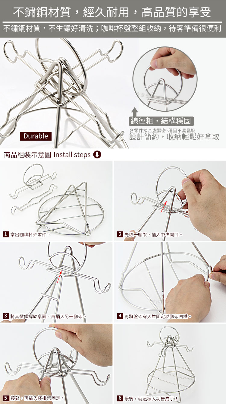 突然想來杯咖啡嗎??下午茶必備利器!! ◆可放四人份咖啡杯盤,造型優雅大方,。 ◆組合式設計,可全拆收納或組合使用,完全不佔空間。 ◆悠閒的午後時光,邀請知心好友,一同享受香醇的下午茶風情。 ◆採#304不鏽鋼材質,不會生鏽,容易清洗保養,經久耐用。 ◆不鏽鋼材不電鍍,直採採用不鏽鋼本色,長保如新,衛生可靠。 ◆全品採不鏽鋼材質製造,不似塑膠材質易斷裂,耐用好清洗,不易藏污垢。 ◆這麼實用、便利的商品,親愛的 朋友們...您絕對不能錯過的收納工具。