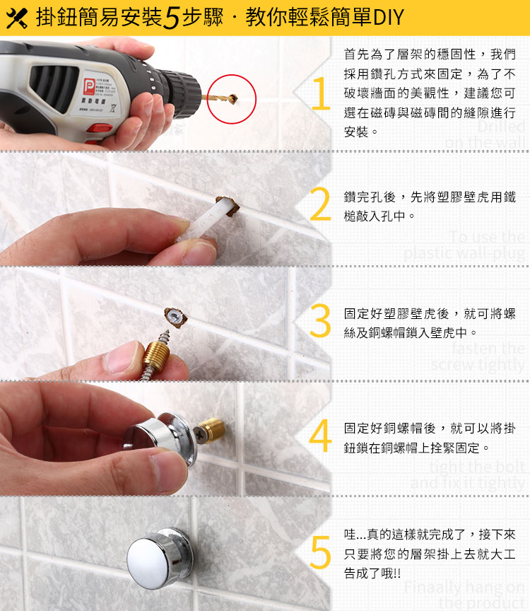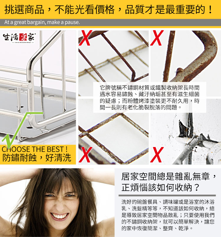 ※SUS304材質,可抗日曬無遇水生鏽問題,SUS304為同質產品最高規格材料,一般不標示材料序號的坊間產品大多是以SUS201或較低階不鏽鋼材所生產的唷~ ※掛鈕的好處:配合鋁鋅合金掛壁鈕安裝在牆面,不會像吸盤有承重掉落問題,安裝方式為將層架掛在鋁鋅合金壁鈕上,日後可以自由取下清潔,沒有拆卸不便的問題。