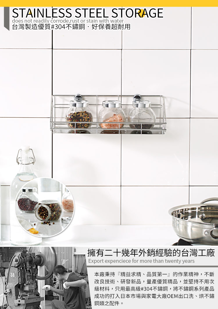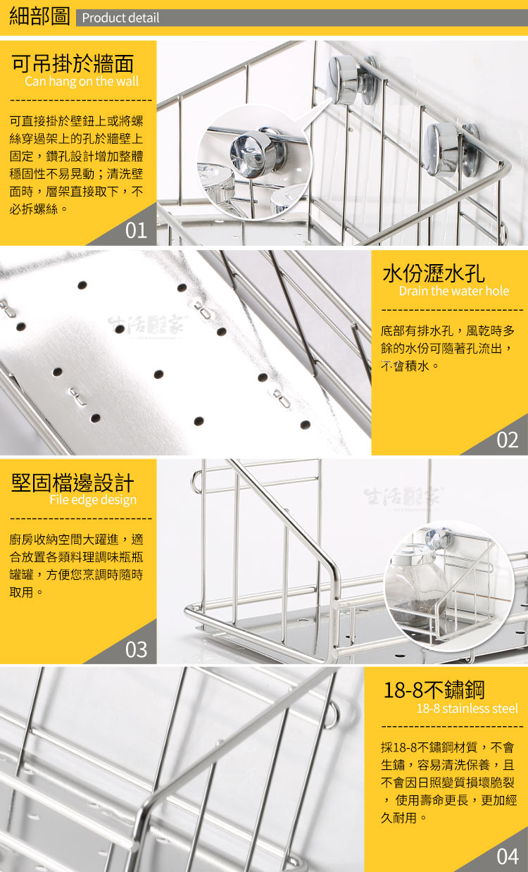 廚房收納空間大躍進,調味料罐收納架讓您的廚房更井然有序!! ◆適合放置各類料理調味瓶瓶罐罐,方便您烹調時隨時取用。 ◆採18-8不鏽鋼材質,不會生鏽,容易清洗保養,經久耐用。 ◆不鏽鋼材不電鍍,直接採用不鏽鋼本色,長保如新,衛生可靠。 ◆全品採不鏽鋼材質製造,不似塑膠材質易斷裂,耐用好清洗,不易藏污垢。 ◆掛鈕式吊掛設計,需要清洗壁面時,可將層架直接取下,不必拆螺絲。 ◆這麼實用、便利的商品,親愛的朋友們...您絕對不能錯過的收納工具。