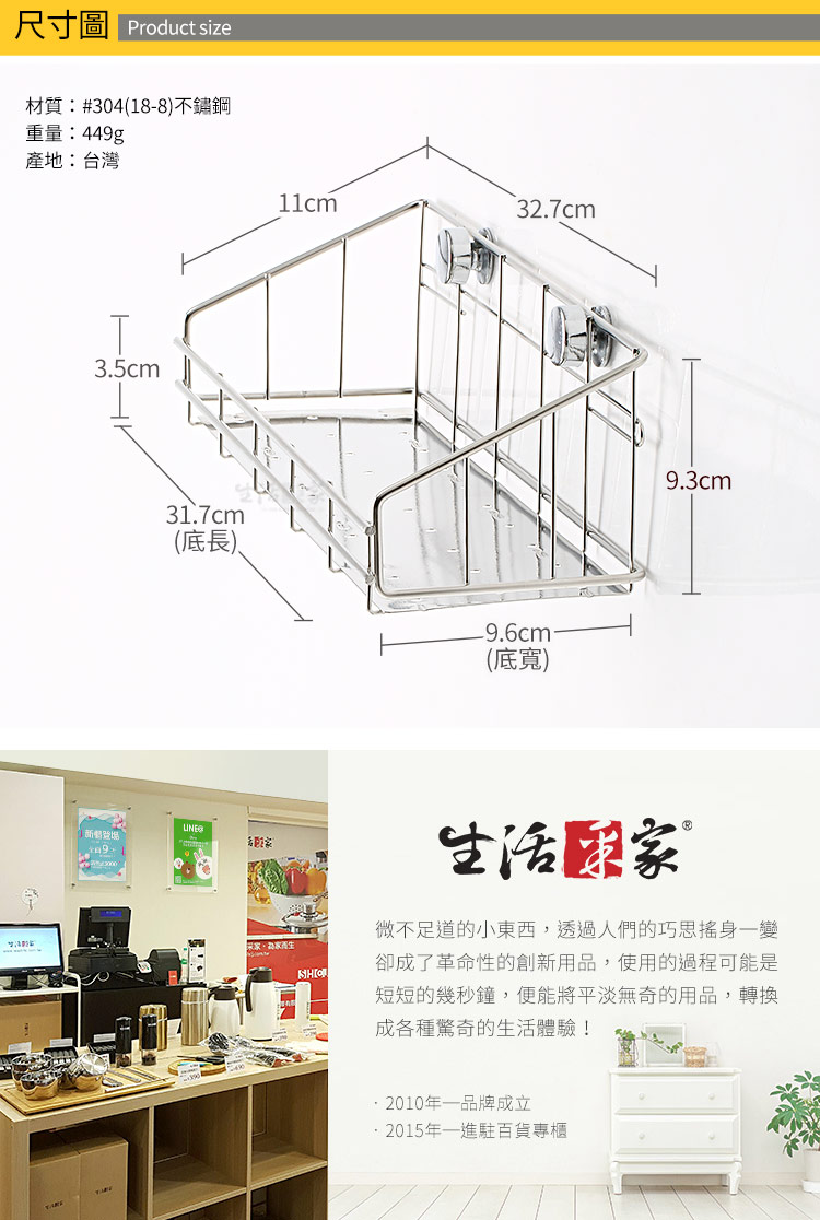 1.尺寸:約寬32.7*深9.6cm*高9.3cm 2.材質:#304(18-8)不鏽鋼 3.重量:約449g(組) 4.產地:台灣 5.商品:調味料架*1、掛鈕配件包*1