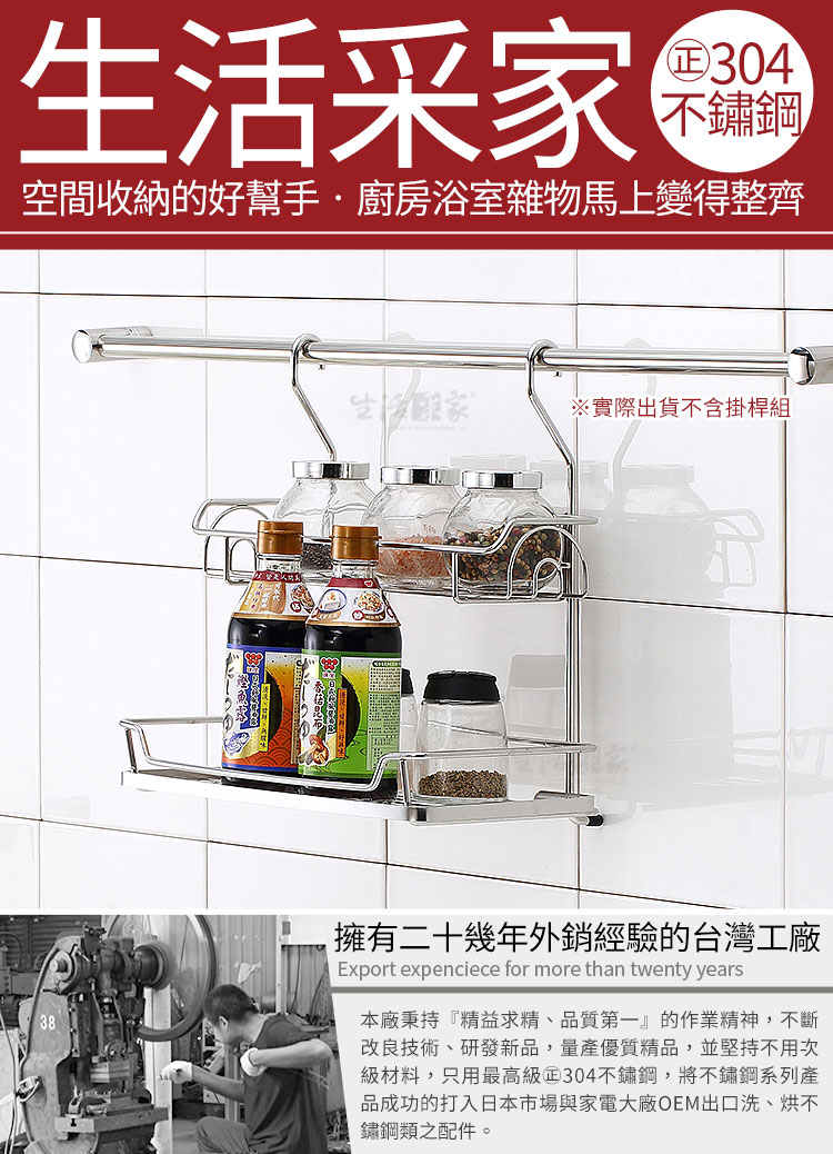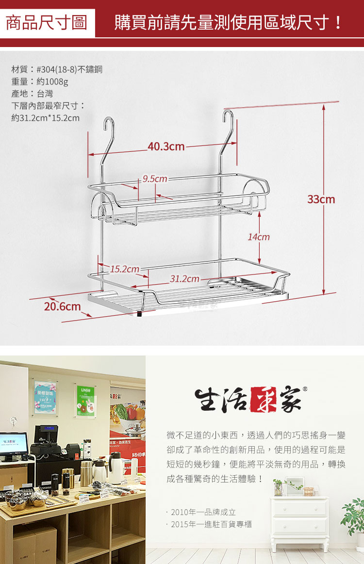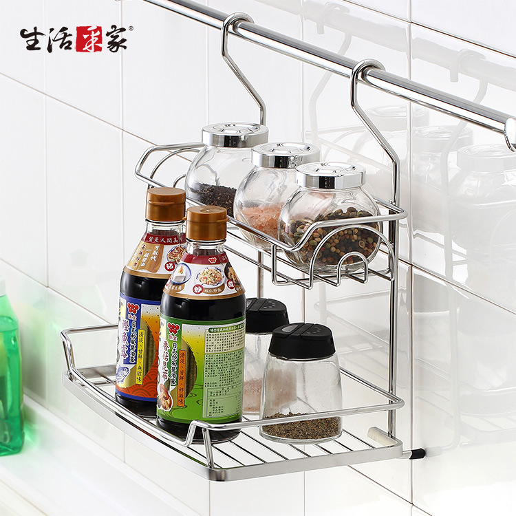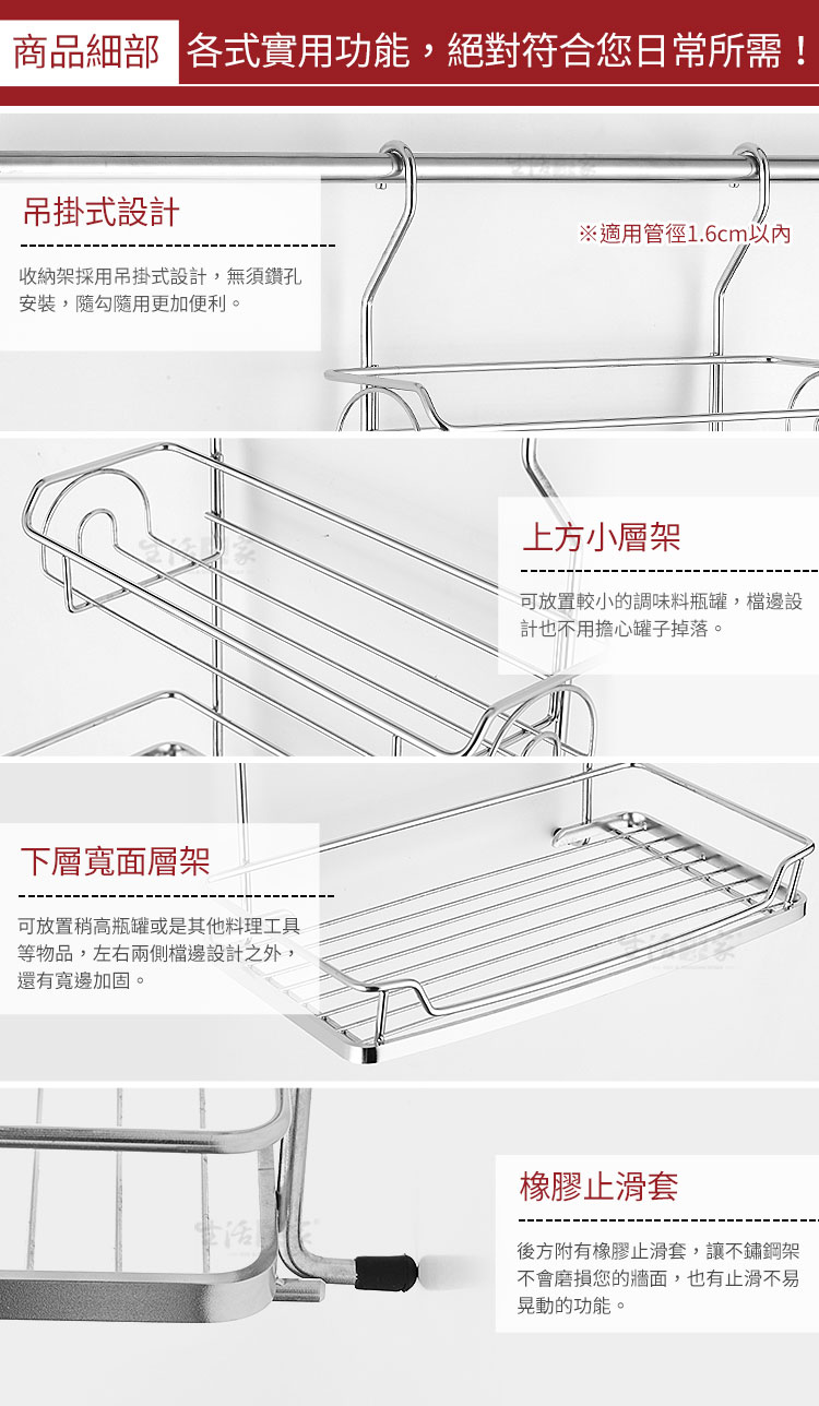 廚房收納空間大躍進,二層式收納架讓您的廚房更井然有序!! ◆上層:深度9.5cm可擺放高度較高的調味用瓶罐。 ◆下層:深度15.2cm可擺放高度較低的調味瓶或罐頭。 ◆採18-8不鏽鋼材質,不會生鏽,容易清洗保養,經久耐用。 ◆不鏽鋼材不電鍍,直採採用不鏽鋼本色,長保如新,衛生可靠。 ◆掛鈕式吊掛設計,需要清洗壁面時,可將層架直接取下,不必拆螺絲。 ◆安裝於廚房,適合放置各類料理調味瓶瓶罐罐,方便您烹調時隨時取用。 ◆安裝簡單,掛架採雙邊掛式設計,適用於直徑1.6cm以內的掛桿使用。 ◆40.3cm大面寬設計,取用一目了然,讓您烹調取用更加得心應手。