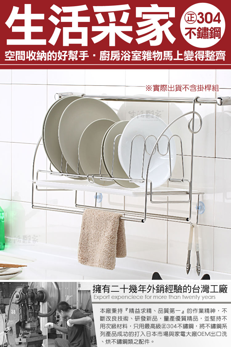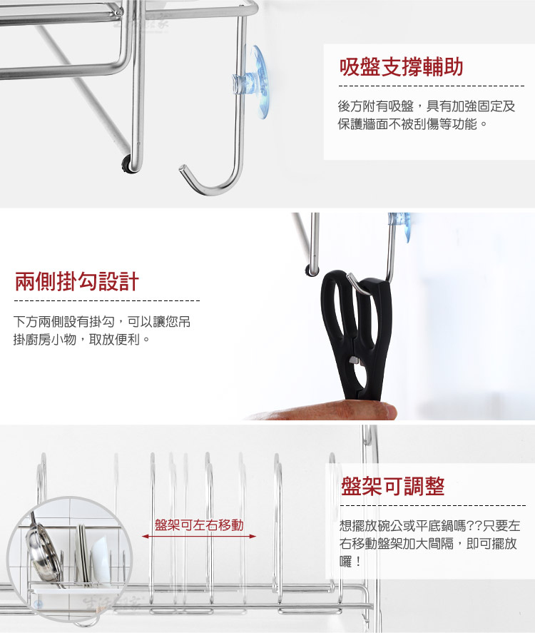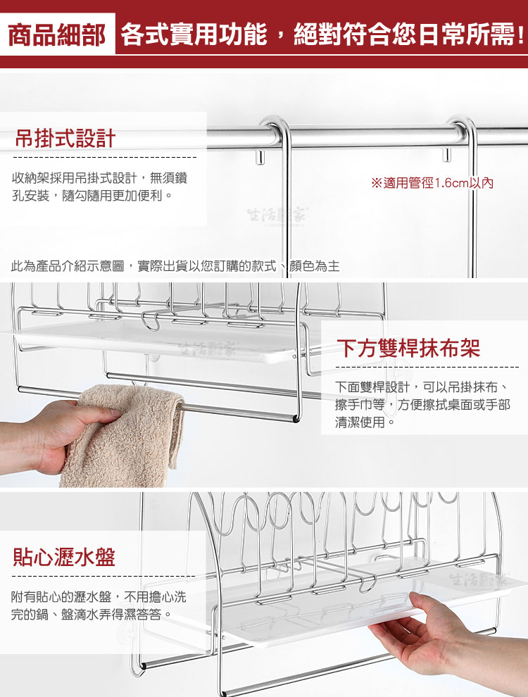 廚房洗完的杯碗、碟盤、抹布等無處風乾嗎?瀝水盤裝不了其它東西嗎?? ◆豪華型配備,兼具收納與瀝水功能,一機多用絕對划算。 ◆清潔後的深盤、淺盤、方盤、圓盤等都可擺放瀝水風乾,較不會有櫥櫃異味。 ◆盤架可左右調整間距,對於較深的盤子或平底鍋,都可擺放風乾或收納。 ◆下方有雙桿抹布掛勾架,清潔後的抹布或小工具等可吊掛風乾收納。 ◆附說明書,全機採DIY組裝設計,組裝使用、拆卸清潔等都方便。 ◆底部附瀝水盤,風乾瀝水不外露,抽取式設計,日常可抽取清潔。 ◆採18-8(㊣304)不鏽鋼材質,不會生鏽,容易清洗保養,經久耐用。 ◆不鏽鋼材不電鍍,直採採用不鏽鋼本色,長保如新,衛生可靠。 ◆全架採不鏽鋼材質,不會因日照變質損壞脆裂, 使用壽命更長。 ◆安裝簡單,掛架採雙邊掛式設計,適用於直徑1.6cm以內的掛桿使用。
