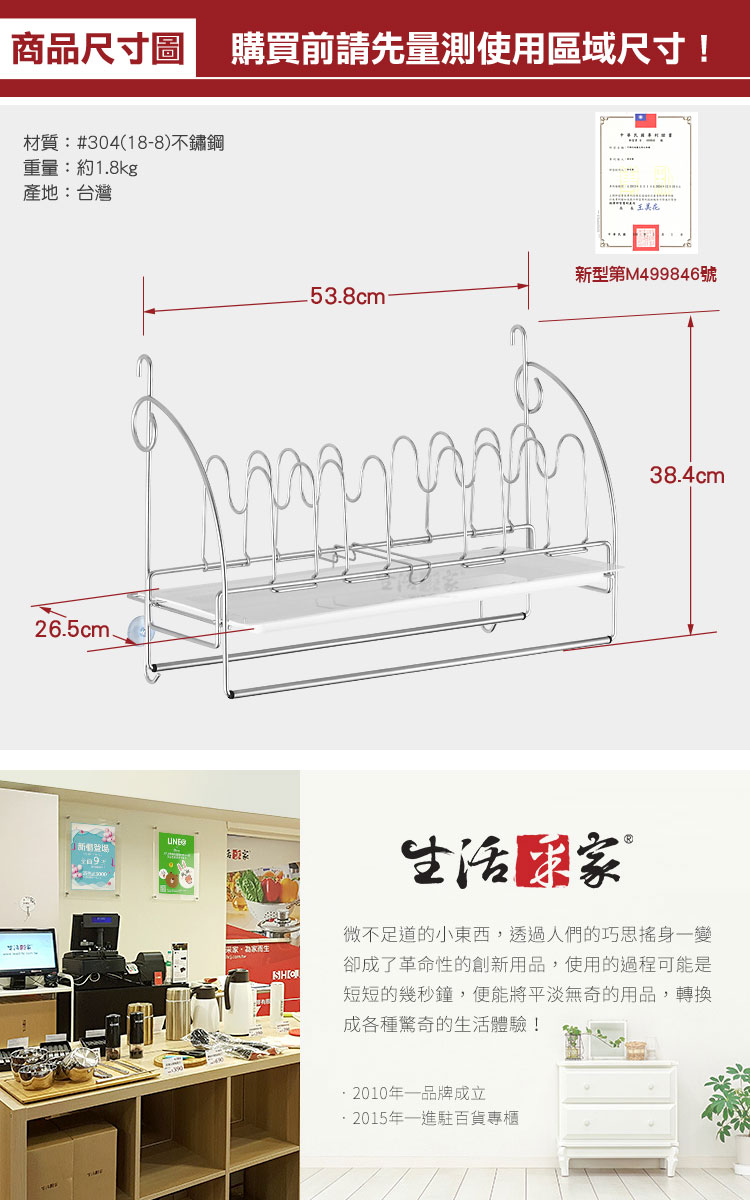 1.尺寸:約寬53.8cm*深26.5cm*高38.4cm 2.材質:#304(18-8)不鏽鋼 3.重量:約1.8kg(入) 4.產地:台灣 5.商品:掛架*2、層架*1、盤架*4、支撐架*1、抹布桿*2、瀝水盤*1、吸盤*2、說明書*1