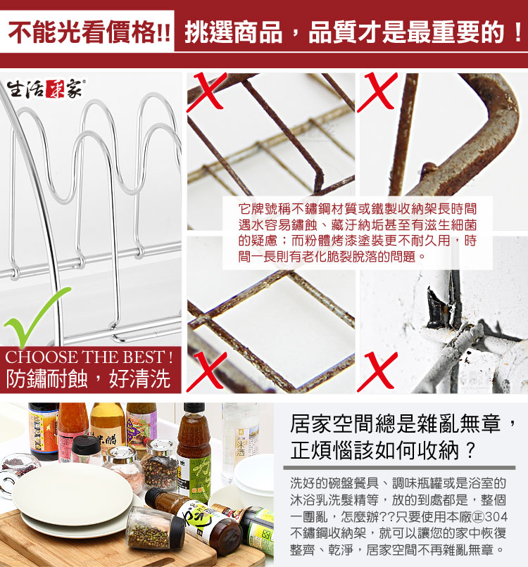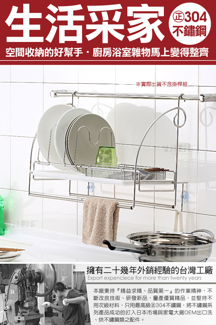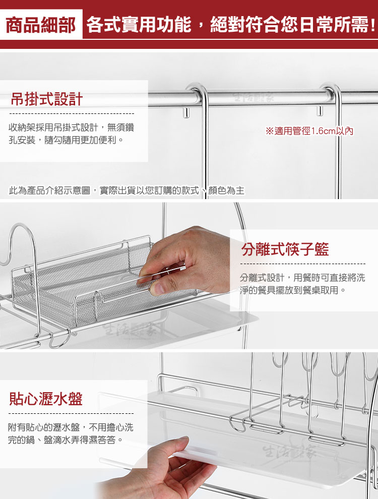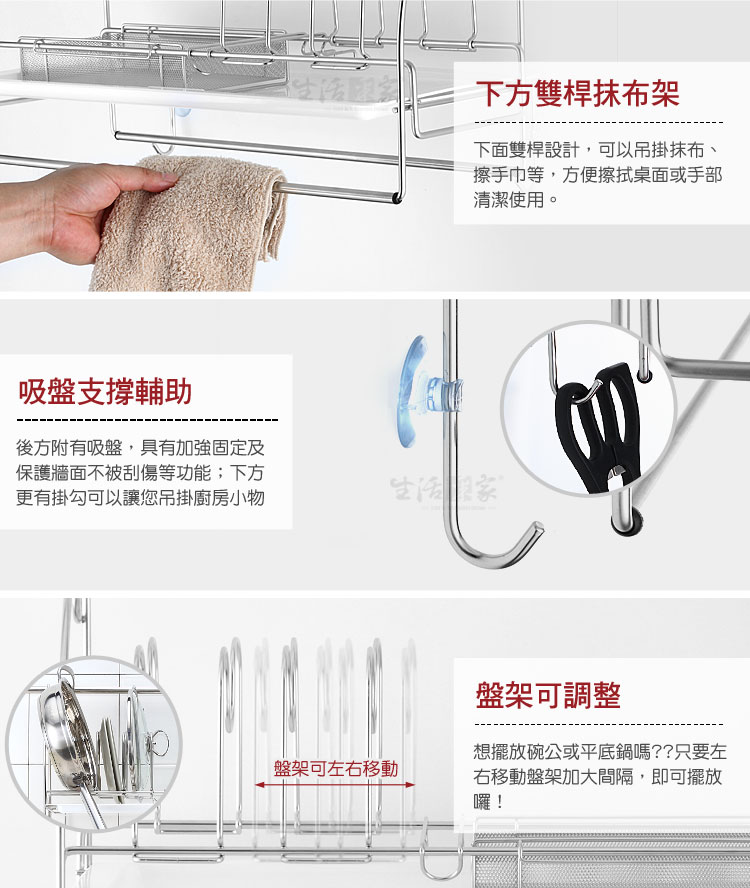 廚房洗完的杯碗、碟盤、抹布等無處風乾嗎?瀝水盤裝不了其它東西嗎?? ◆豪華型配備,兼具收納與瀝水功能,一機多用絕對划算。 ◆清潔後的杯子、碗筷、碟盤等都可擺放瀝水風乾,較不會有櫥櫃異味。 ◆盤架間距可左右調整,對於較深的餐盤或平底鍋等,都可以擺放風乾或收納。 ◆下方有雙桿抹布掛勾架,清潔後的抹布或小工具等可吊掛風乾收納。 ◆附說明書,全機採DIY組裝設計,組裝使用、拆卸清潔等都方便。 ◆底部附瀝水盤,風乾瀝水不外露,抽取式設計,日常可抽取清潔。 ◆採18-8(㊣304)不鏽鋼材質,不會生鏽,容易清洗保養,經久耐用。 ◆不鏽鋼材不電鍍,直採採用不鏽鋼本色,長保如新,衛生可靠。 ◆全架採不鏽鋼材質,不會因日照變質損壞脆裂, 使用壽命更長。 ◆安裝簡單,掛架採雙邊掛式設計,適用於直徑1.6cm以內的掛桿使用。