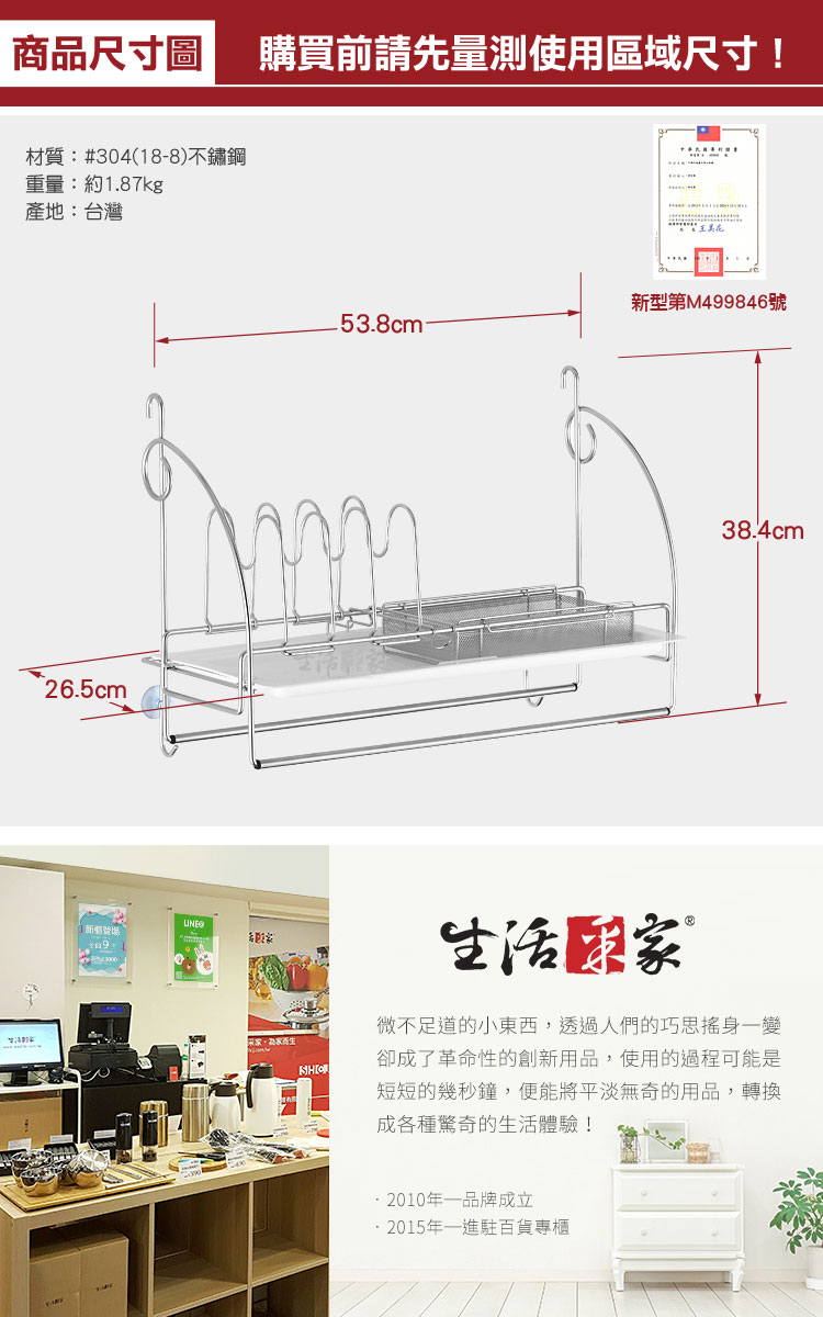 1.尺寸:約寬53.8cm*深26.5cm*高38.4cm 2.材質:#304(18-8)不鏽鋼 3.重量:約1.87kg(組) 4.產地:台灣 5.商品:掛架*2、層架*1、盤架*2、筷網架*1、抹布桿*2、瀝水盤*1、吸盤*2、說明書*1
